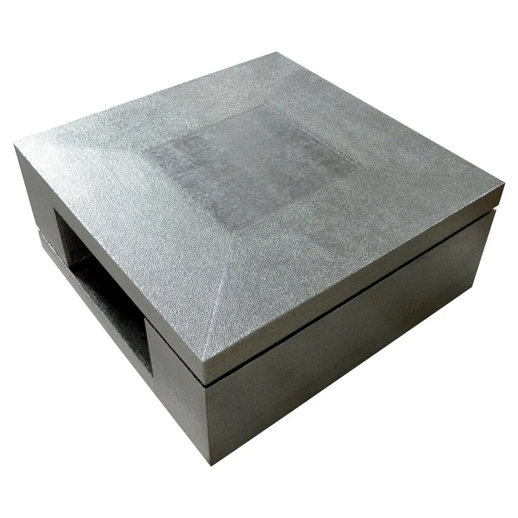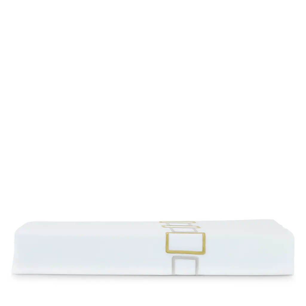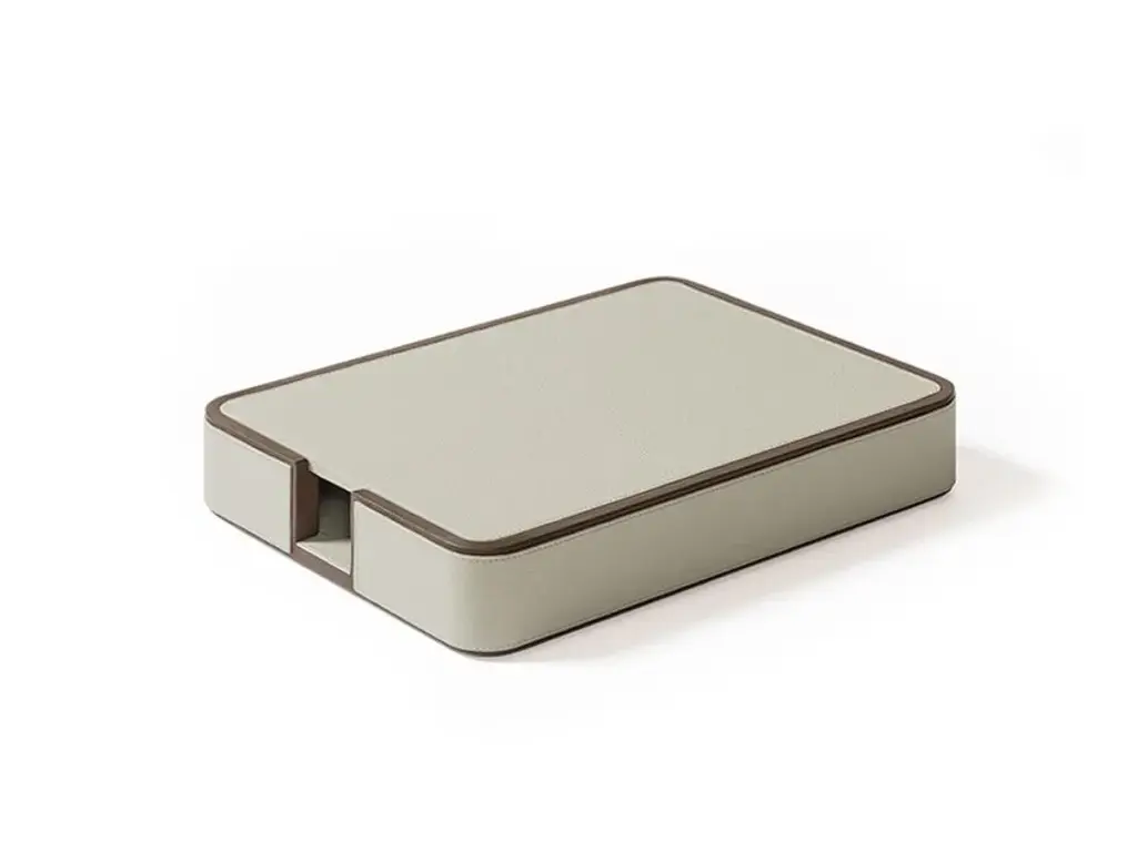 This elegant box is a striking accent piece to add to a desk and will provide ampler storage space for A4 paper. Its minimalist silhouette comprises a rectangular box resting on a brushed brass-finished metal plinth base and a lid, both elements upholstered in white leather with tonal stitching. An opening in the front allows access to the box without opening the lid. The metal is also available in chrome or bronze finish.