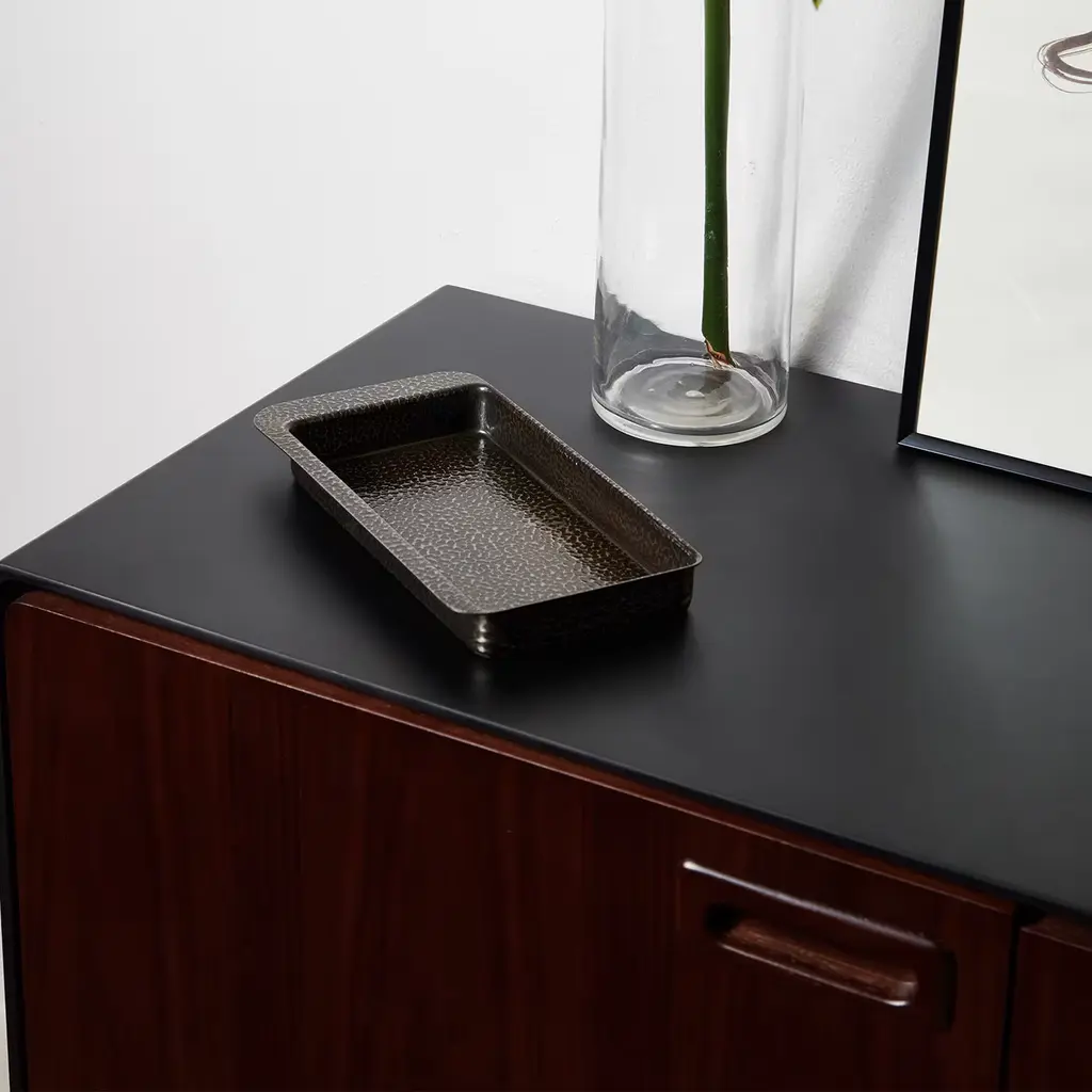 Timelessly charming, this empty pocket tray will make a captivating accent to a stylish dining table during a special event or a precious addition to an entryway console of both contemporary or traditional character. Meticulously handcrafted of burnished bronze, it is hammered in an exquisite turtle-like texture. Its sleek, rectangular shape can be adorned with an internal removable pad in soft fabric, available in pink, blue, light blue, or cream-white hues upon request to the Concierge.