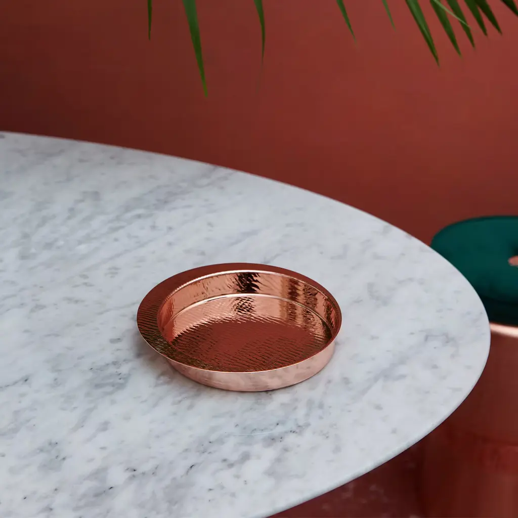 A sublime celebration of copper, this extraordinary empty pocket tray will create a captivating and functional corner in any decor. Entirely handcrafted of copper, it is hammered by hand in a water-like pattern that creates intriguing interplays of lights and reflections. Also available with an internal removable pad (pink, blue, light blue, or cream white), or made of gold-finished brass, silver alloy, or burnished bronze, please contact the Concierge.