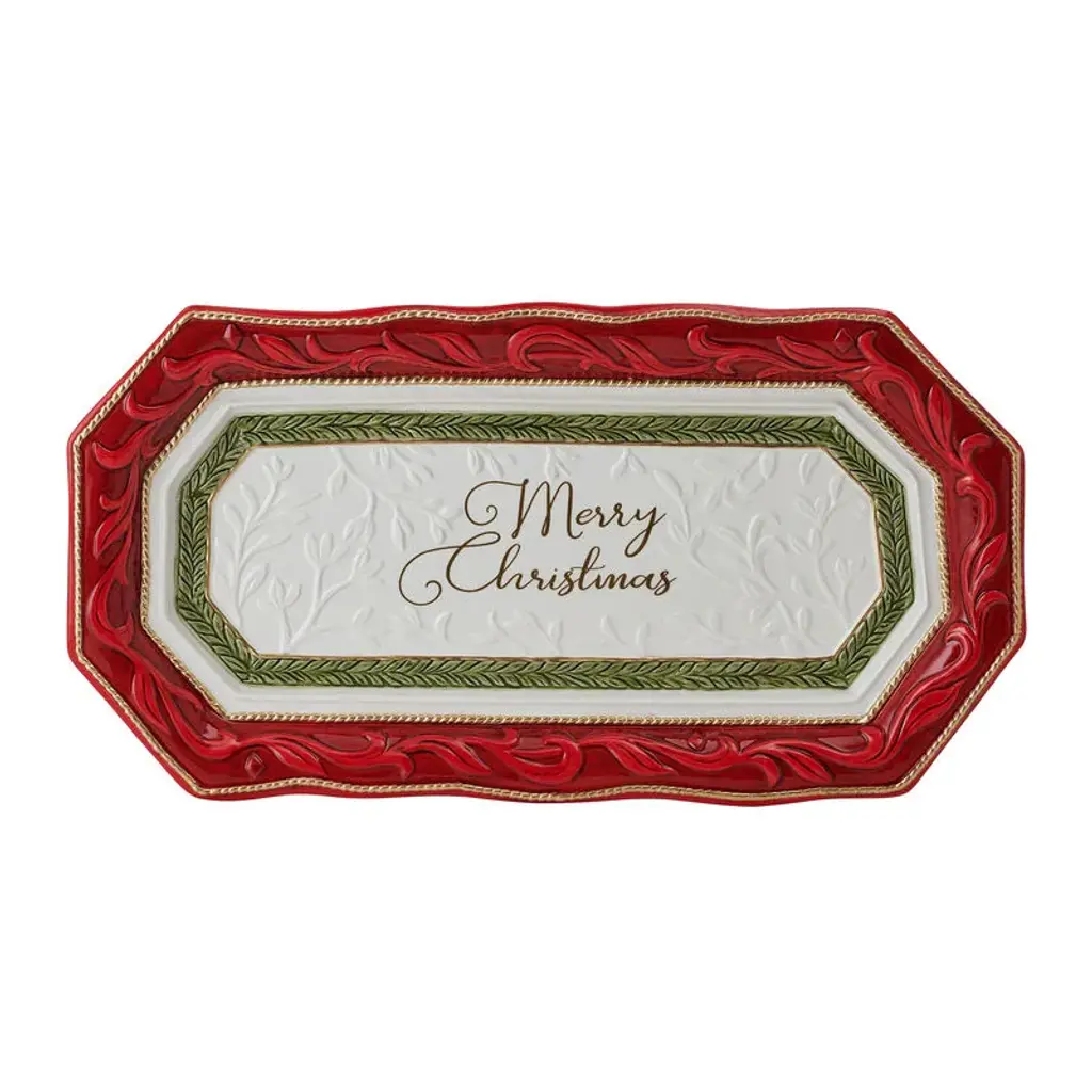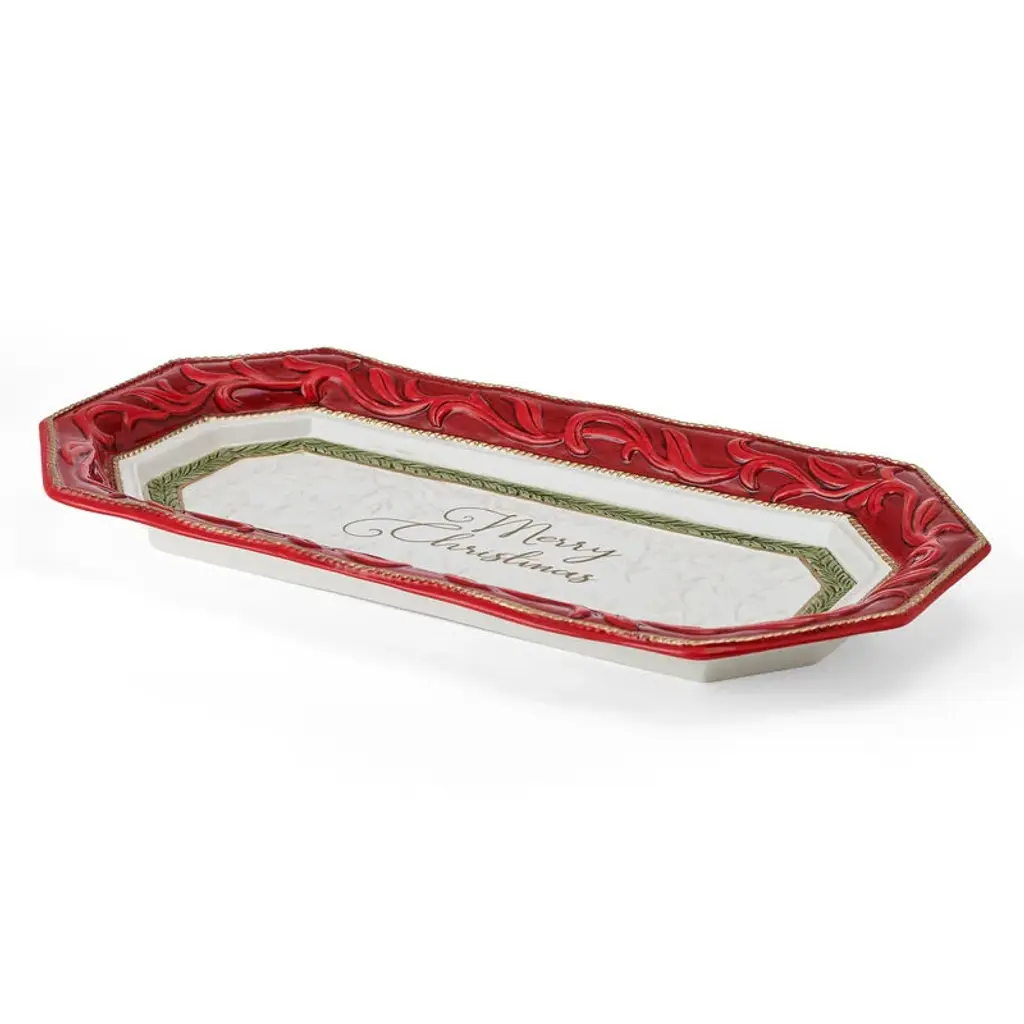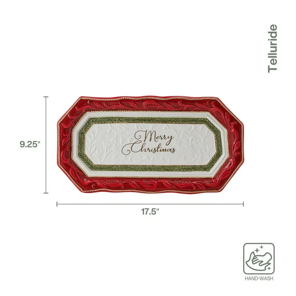 Bring a festive, celebratory feel to all your holiday gatherings with this Telluride Bread Tray by Fitz and Floyd. Crafted of ceramic earthenware, this elegant bowl in vibrant red with a white center and green and gold accents features a raised garland design around the rim and the sentiment "Merry Christmas" in the center. Generously sized, this tray is perfect for serving sliced loaves of bread as well as appetizers, cookies, and more. Measures 17-1/4 inches long by 9-1/4 inc hes wide by 1-1/2 inch high. Hand-washing recommended to extend the life of the product.