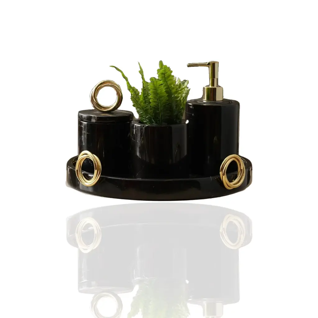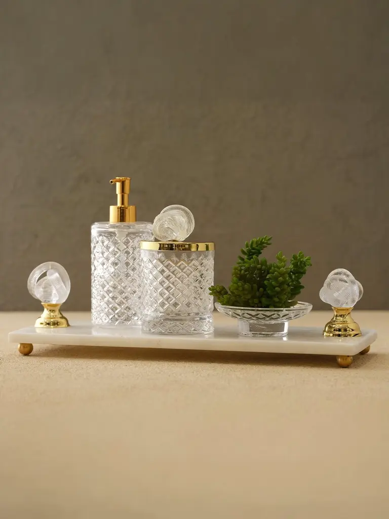 The Glass Bathroom Set offers a perfect blend of elegance and functionality, featuring refined diamond-cut glass pieces accented with luxurious gold-toned details. This five-piece set includes a coordinating tray, toothbrush holder, lidded jar, soap dish, and liquid soap dispenser—all beautifully arranged to enhance vanity displays or guest bathrooms. The timeless sparkle of faceted glass paired with gilded accents creates a look that’s both classic and contemporary.