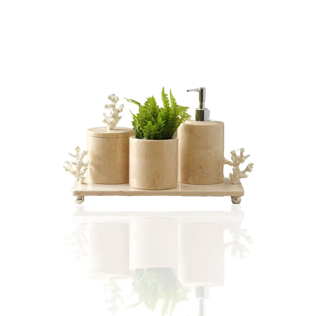 Five-Pieces Marble & Glass Bathroom Set With Tray, Handmade