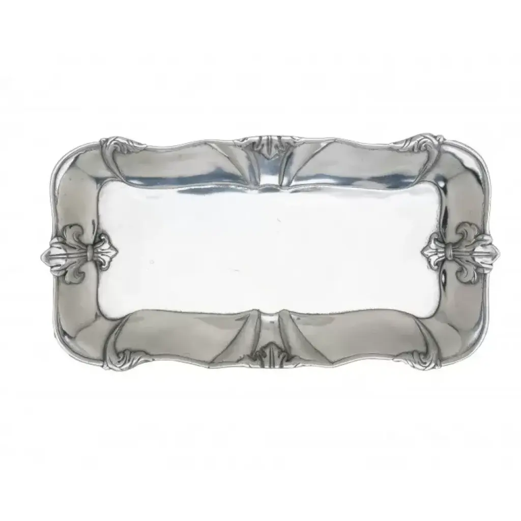 Plant your next dish within the visually appealing layout of Arthur Court's Fleur-De-Lis Acanthus Oblong Tray. Fleur-de-lis symbols rest in the middle of each side as additonal flourishes and acanthus patterns flow around them. The openwork design distinguishes this handmade, aluminum tray.