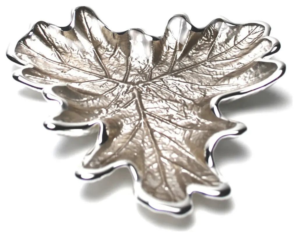 The Foglia Grape Leaf Tray, 7.5" Diameter, is created from Italian glass that is hand decorated in beige and finished with a layer of pure silver applied to the outer surface of the glass that gives a luxury touch to your table and home. Exceptional Value with Elegant Style made in Italy. Professional packing for each item shipped from our U. S warehouse. As each piece is handcrafted no two pieces are exactly alike and slight variations in color and size may occur.Foglia Grape Leaf Tray Beige Silver 7.5"� Dia.Made in ItalyExceptional Value and Elegant StyleAs each piece is handcrafted no two pieces are exactly alike and slight variations in color and size may occur.