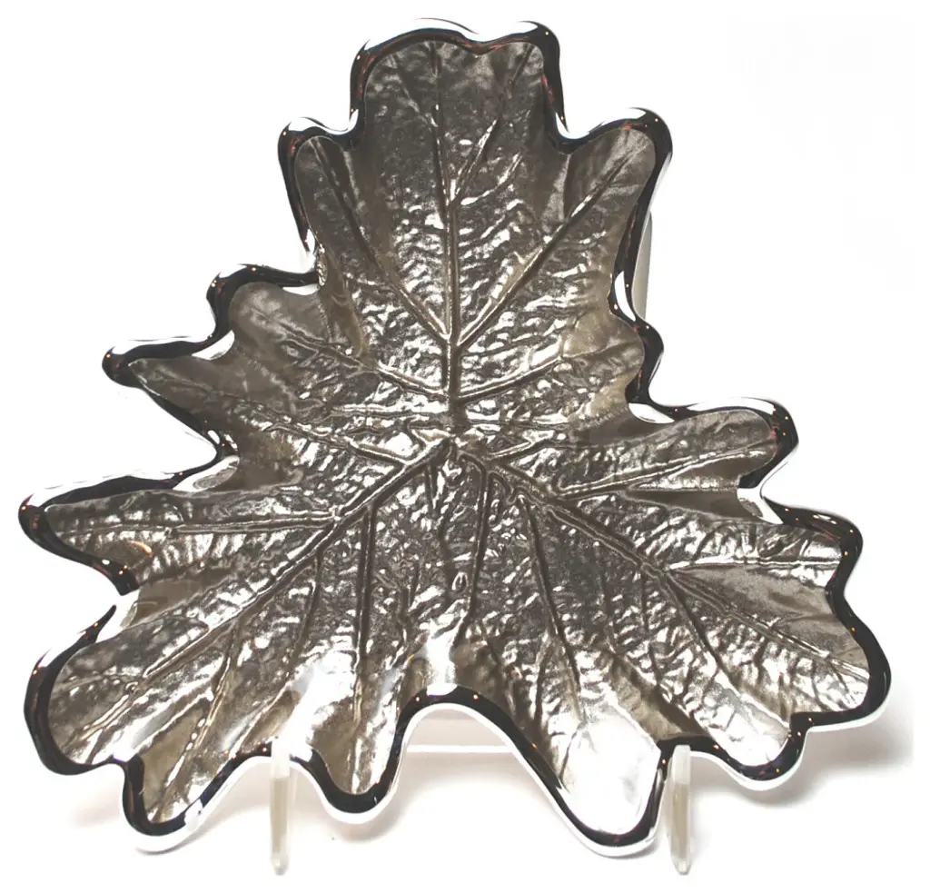 The Foglia Grape Leaf Tray, 7.5" Diameter, is created from Italian glass that is hand decorated in sky blue and finished with a layer of pure silver applied to the outer surface of the glass that gives a luxury touch to your table and home. Exceptional Value with Elegant Style made in Italy. Professional packing for each item shipped from our U. S warehouse. As each piece is handcrafted no two pieces are exactly alike and slight variations in color and size may occur.Foglia Grape Leaf Tray Sky Blue Silver 7.5"� Dia.Made in ItalyExceptional Value and Elegant StyleAs each piece is handcrafted no two pieces are exactly alike and slight variations in color and size may occur.