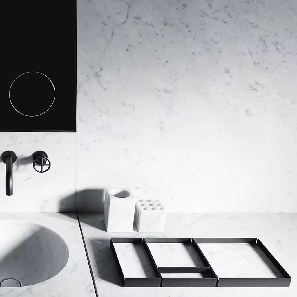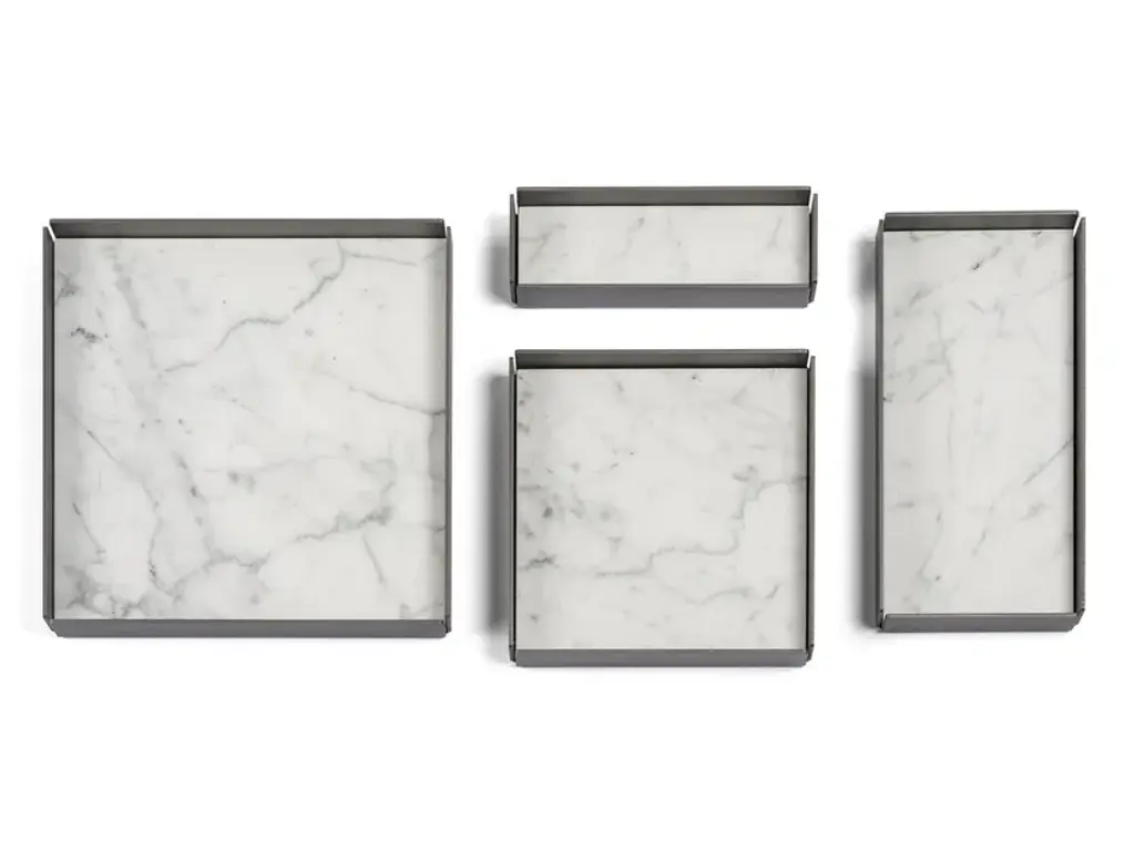 The Fontane Bianche Modular Tray Set comprises four individual trays, which can either be used separately or as an ensemble in any desired configuration. Each tray is crafted from a single slab of Bianco Carrara marble and is framed with a metal trim. Perfect for soap, flannels or beauty products.