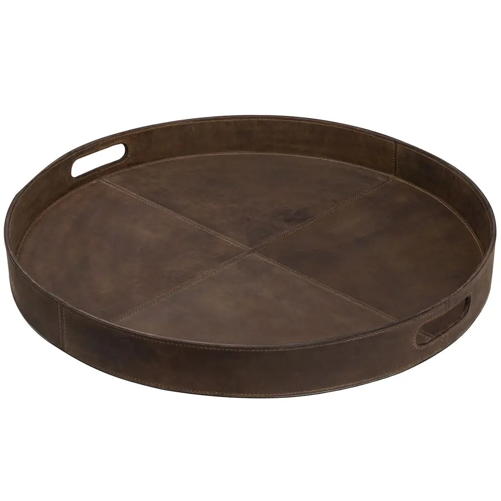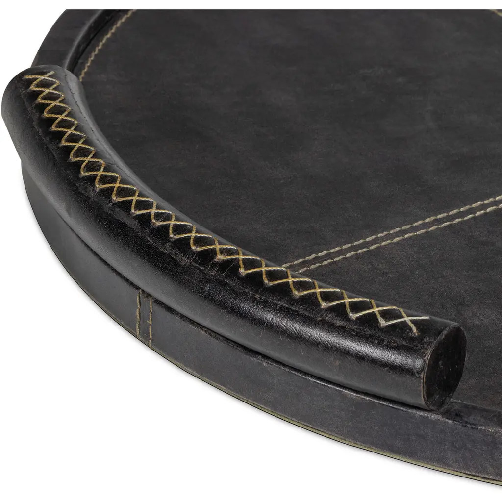 A handsome, black leather statement piece featuring intricate baseball stitching on the platform and lace stitching on the oversized handles. Its round shape and weathered finish translate into a piece that lacks pretension but emanates comfort and familiarity.