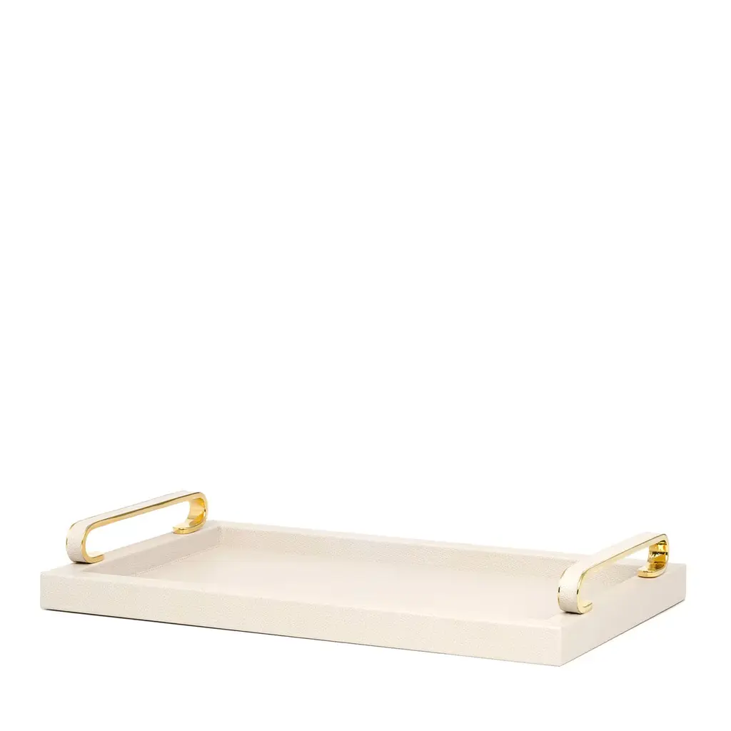 A showcase of impeccable craftsmanship exemplifying modern taste for sleek yet precious items, this superb tray will make for an elegant solution to serve drinks or food in professional and residential contexts, alike. The rigorous wooden shell is entirely wrapped in softly textured, taupe calfskin, also enriching the C-shaped handles in glossy, gold-finished brass for increased textural appeal. Please inquire with the Concierge for available color and size variants.