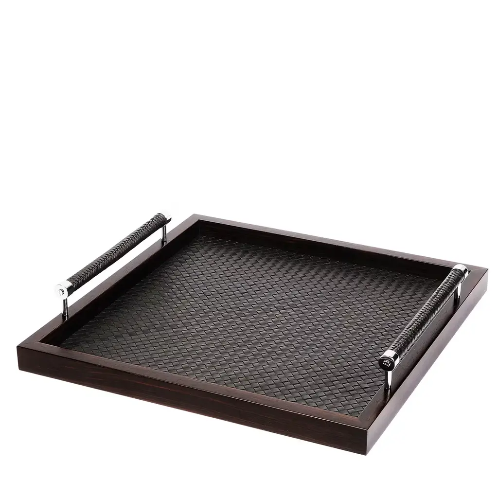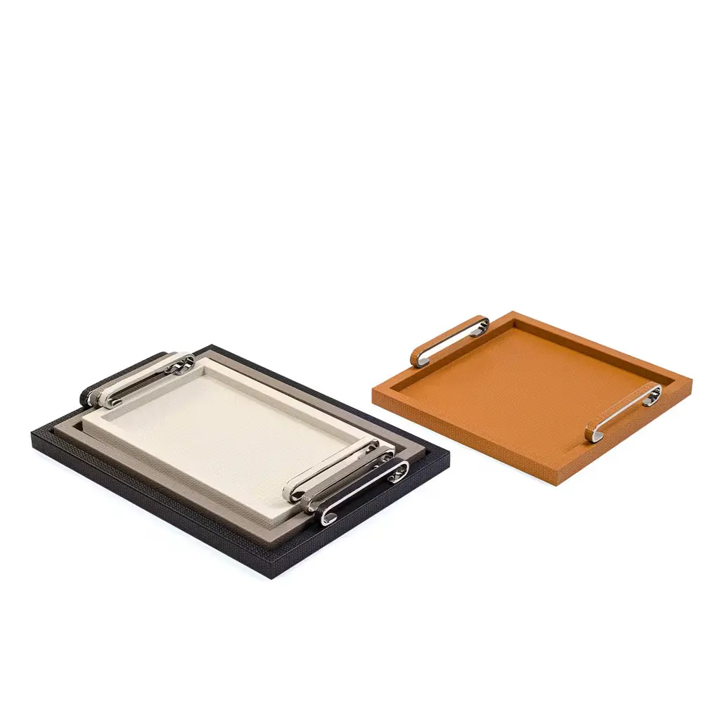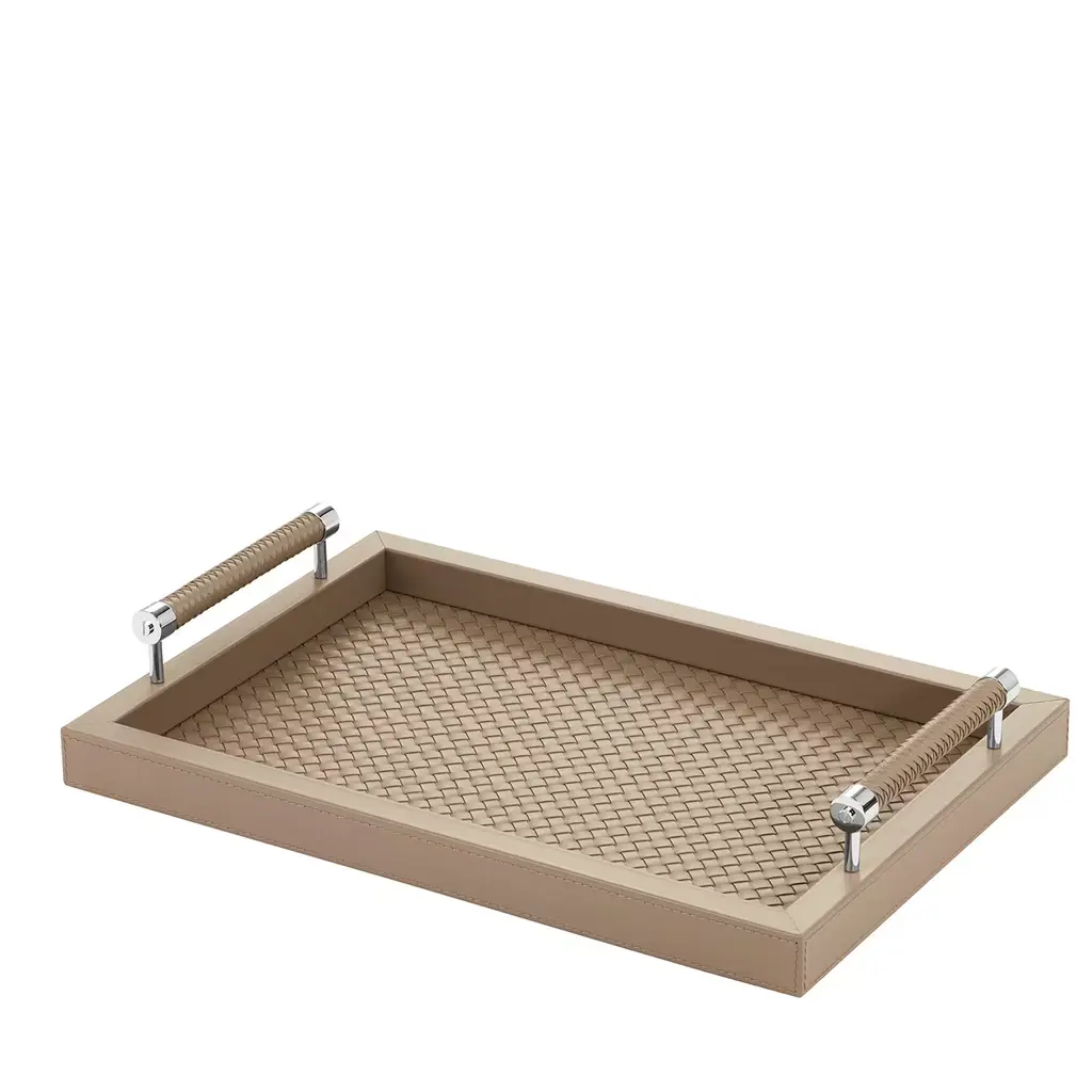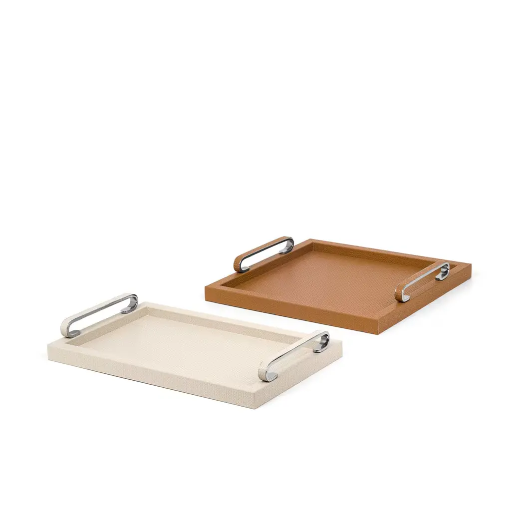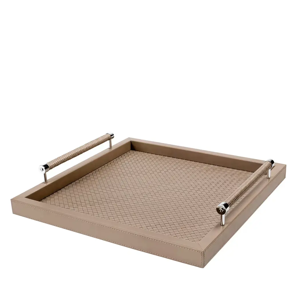 Either to serve water or coffee during a formal meeting or to display refined collectibles in a modern home, this design will stand out for its luxe allure and sophisticated craftsmanship. The rectangular wooden frame is tightly upholstered in textured, camel-hued calfskin also featured as a glamorous detail for the C-shaped handles in chromed brass (also golden on request). The design is available in four sizes and many color options, please contact the Concierge.