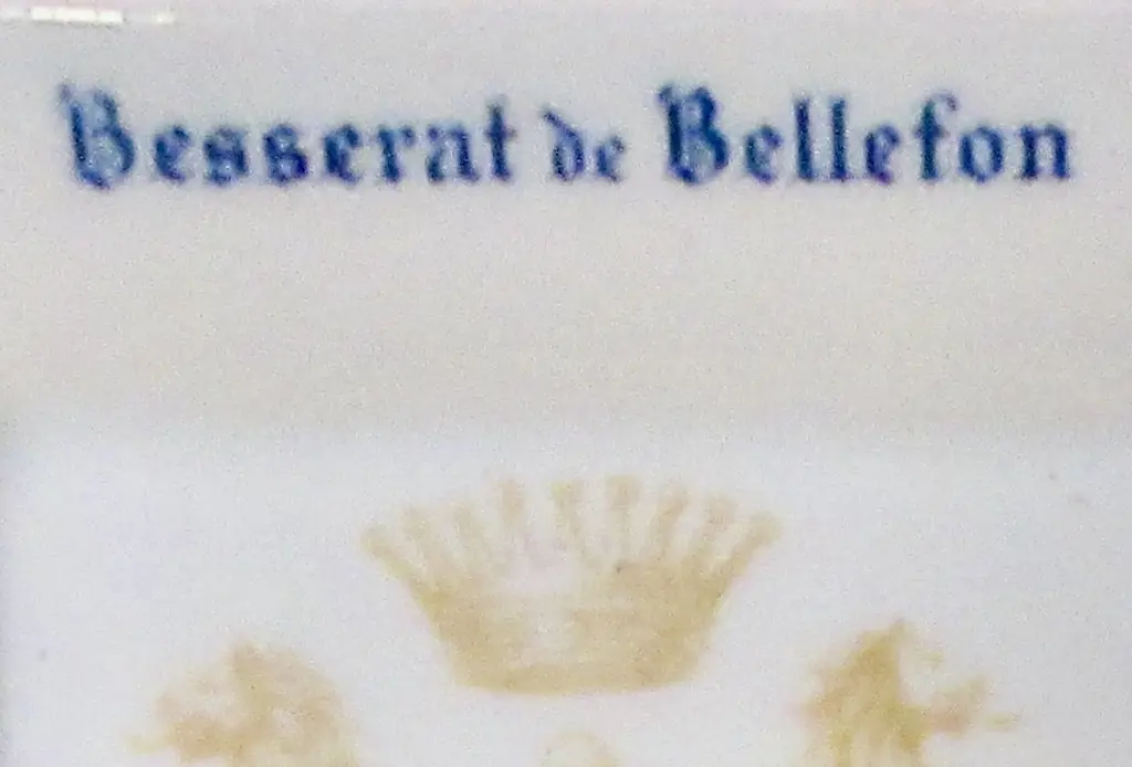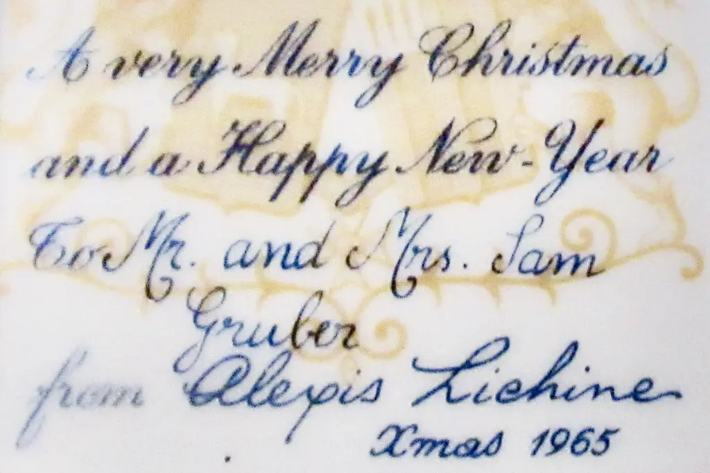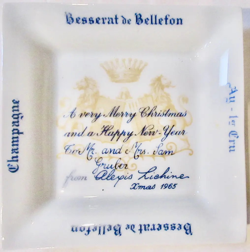 French porcelain tray advertising Besserat de Bellefon champagne doubles as a hand-painted 1965 Christmas card to Mr. and Mrs. Sam Gruber from the Bordeaux vintner and eminent 20th century wine writer Alexis Lichine. Marked "Porcelain de Couleuvres France Fondee en 1789." A wonderful piece of wine history.