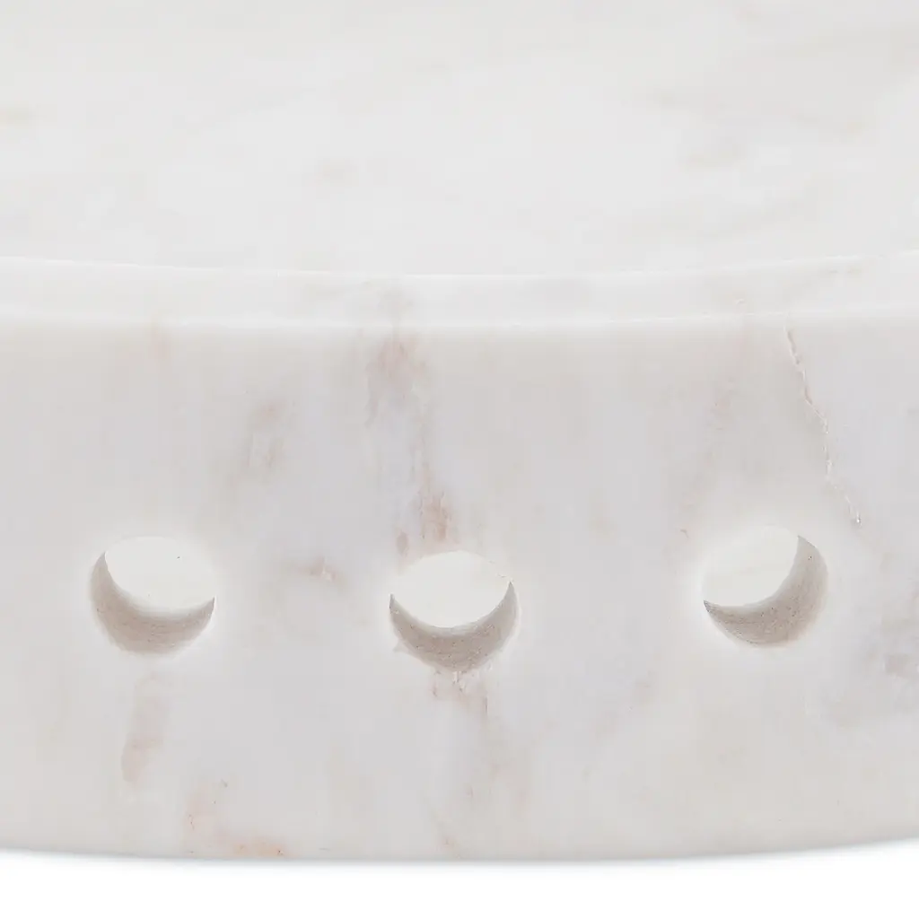 The Freya White Marble Tray is created by an engineering feat, as the white decorative tray is cut on a CNC machine that carves out the interior and drills the holes that ornament the circumference of the piece. An artisanal aspect to the design is the uniformity of the thickness of the sides and the regular spacing of the holes, both of which require refined handicraft skills. The beauty of real stone is evident here, as the subtle veining brings elegance to this tabletop element. Ships In 7-10 Business Days This image is for illustrative purposes only. The colors shown are accurate within the constraints of lighting, photography, and the color accuracy of your screen.