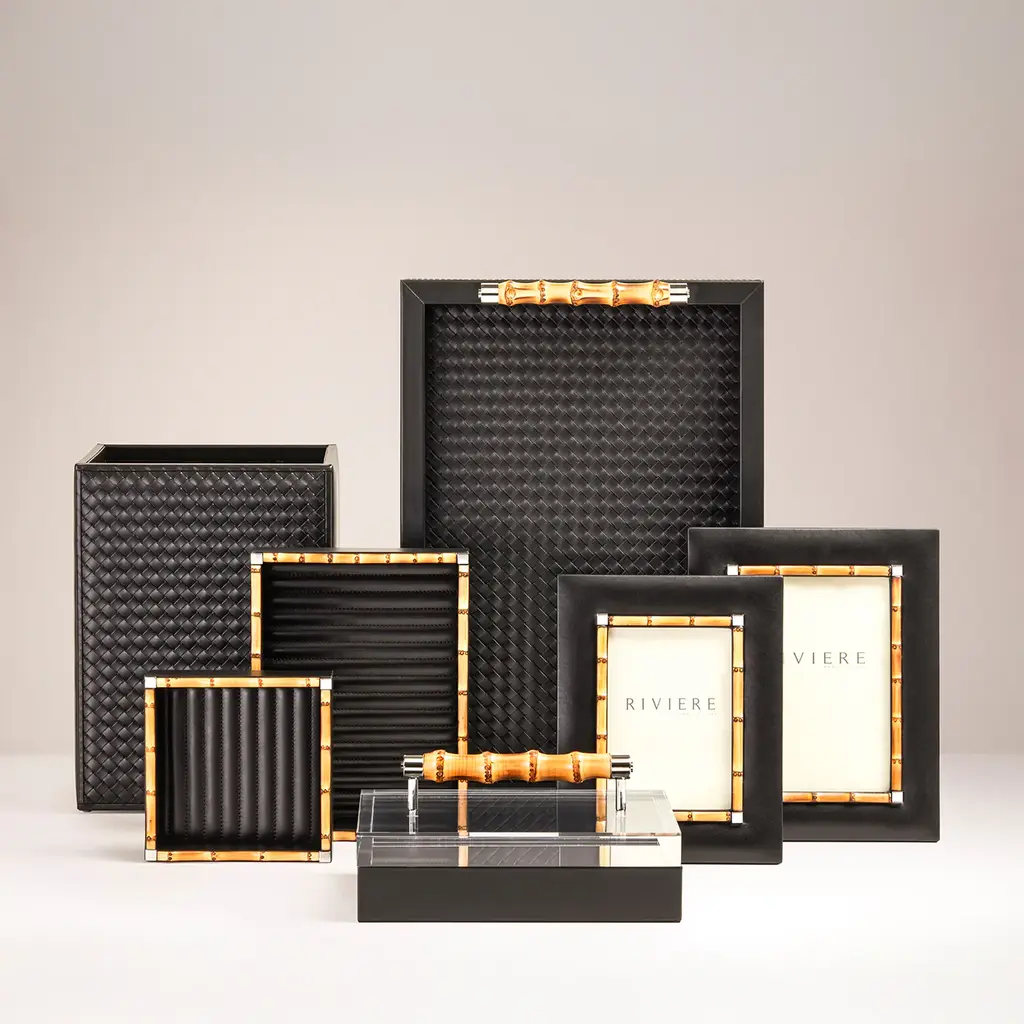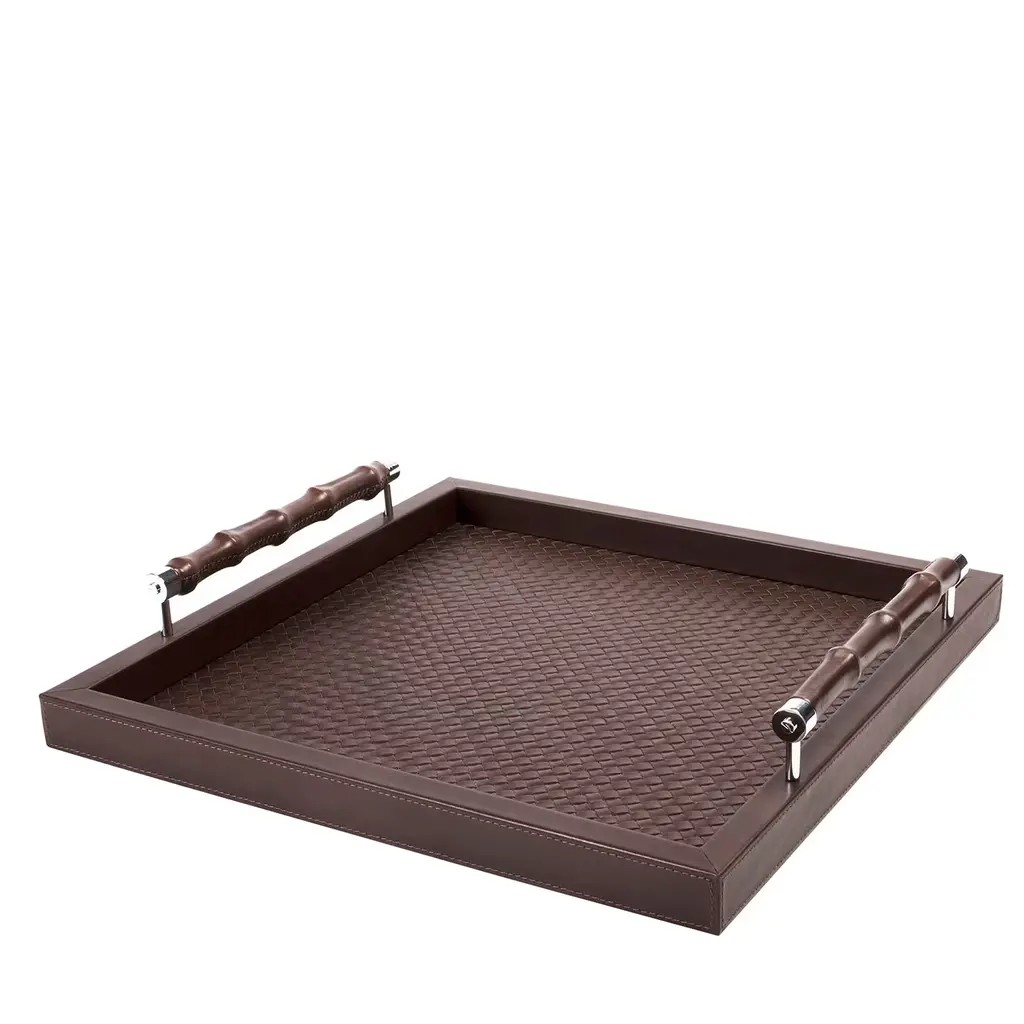 Leather tray with handwoven leather lining, and bamboo handles. Minimal yet elegant, Frida tray is a unique object exquisitely versatile. The simple shape allows the bamboo handle to lead the role. This stunning decorative tray deserves to be displayed as a centerpiece even when not in use.