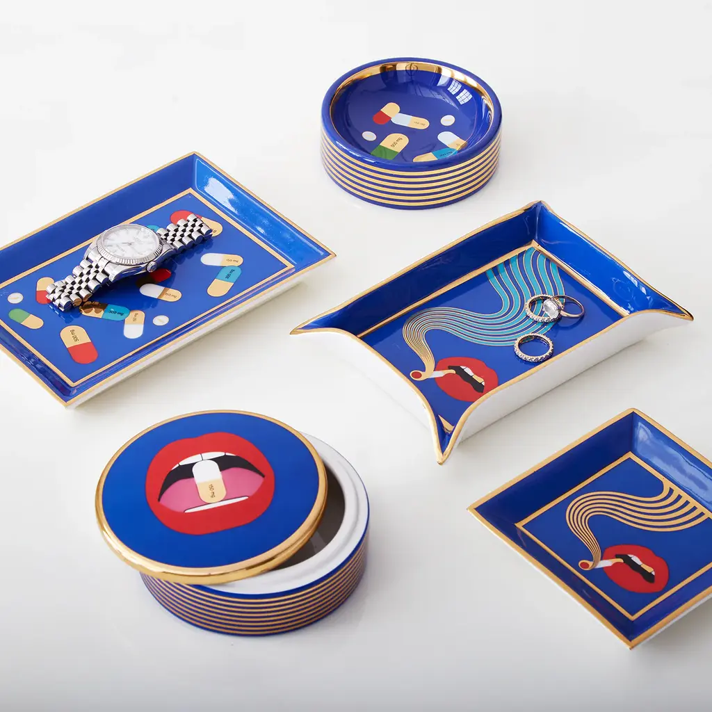 Hangover-Free Hedonism. Sexy, seductive and saucy, our petite trays are the little quelque chose you didn't know you needed but absolutely do. Add a kiss of tough glam to your bedside, bathroom, or tabletop. Crafted from high-fired porcelain with real gold accents. Indulge yourself or give one as a gutsy gift—our Full Dose set comes packaged in a nifty box.