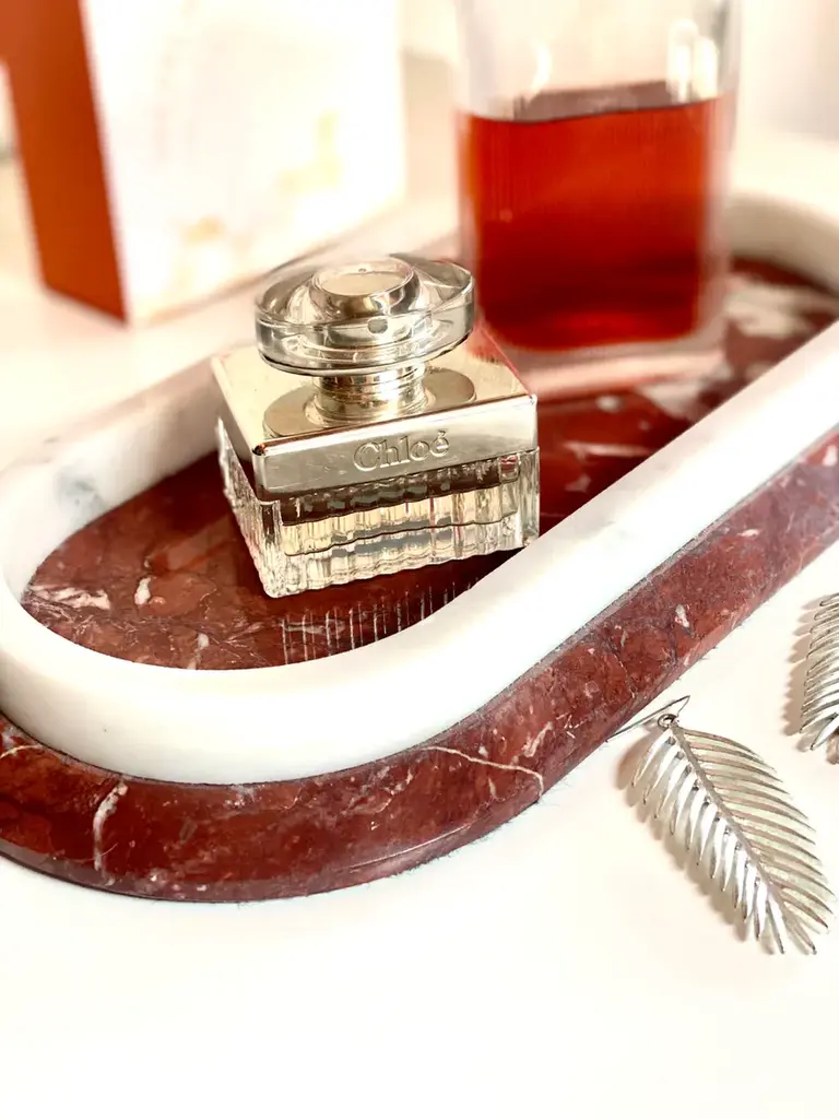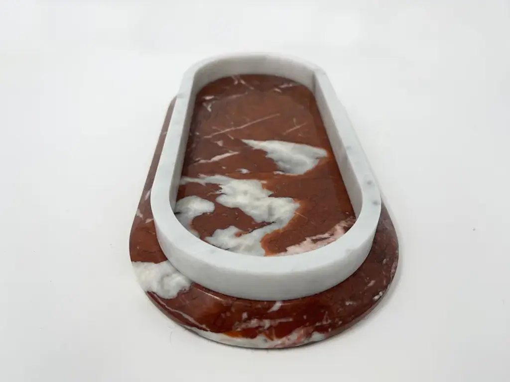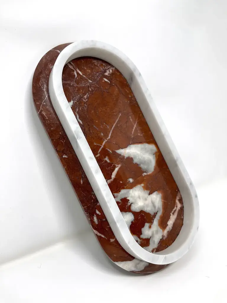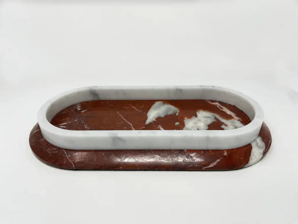 Fuoco is a tray composed of two different marbles, Rosso Francia and Carrara. Elegant, versatile, designer, it knows how to adapt perfectly to use in the kitchen between hotplates and stoves, or as a piece of furniture."Fuoco" is part of the "Remarble" product line, a collection of marble objects made from "leftover" materials from other projects, created in collaboration with students from the Department of Management at Ca' Foscari University of Venice. The "Fuoco" marble tray, proposed using Rosso Francia combined with Carrara White and Giallo Antico accompanied by Sahara Noir, can be customized according to the customer's wishes. It is possible to choose the material to make it more akin to the type of use and the environment in which it will be placed. Variations in color or slight imperfections are the result of the craftsmanship of this article and are not to be considered defects.)