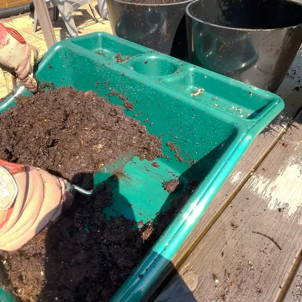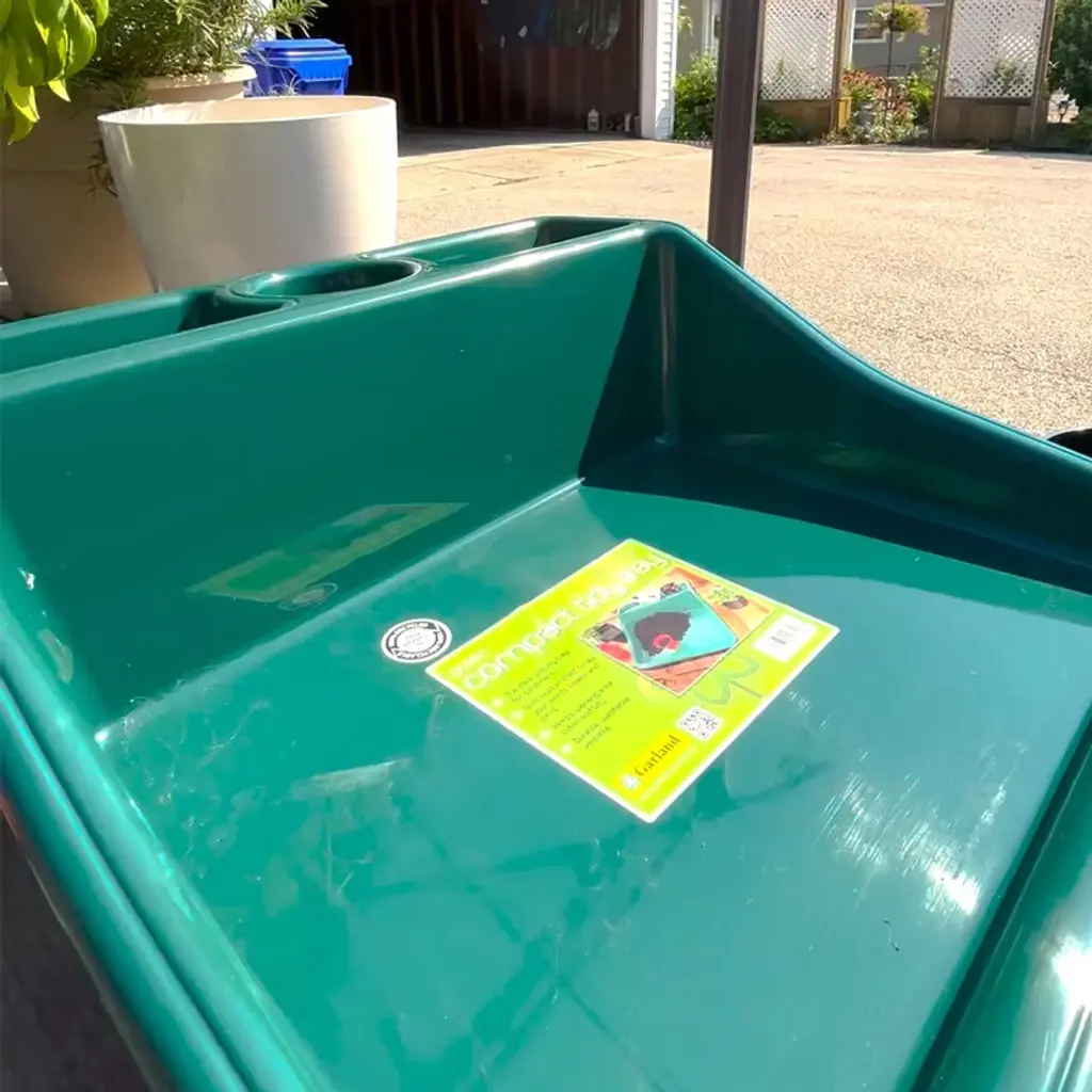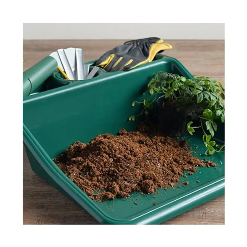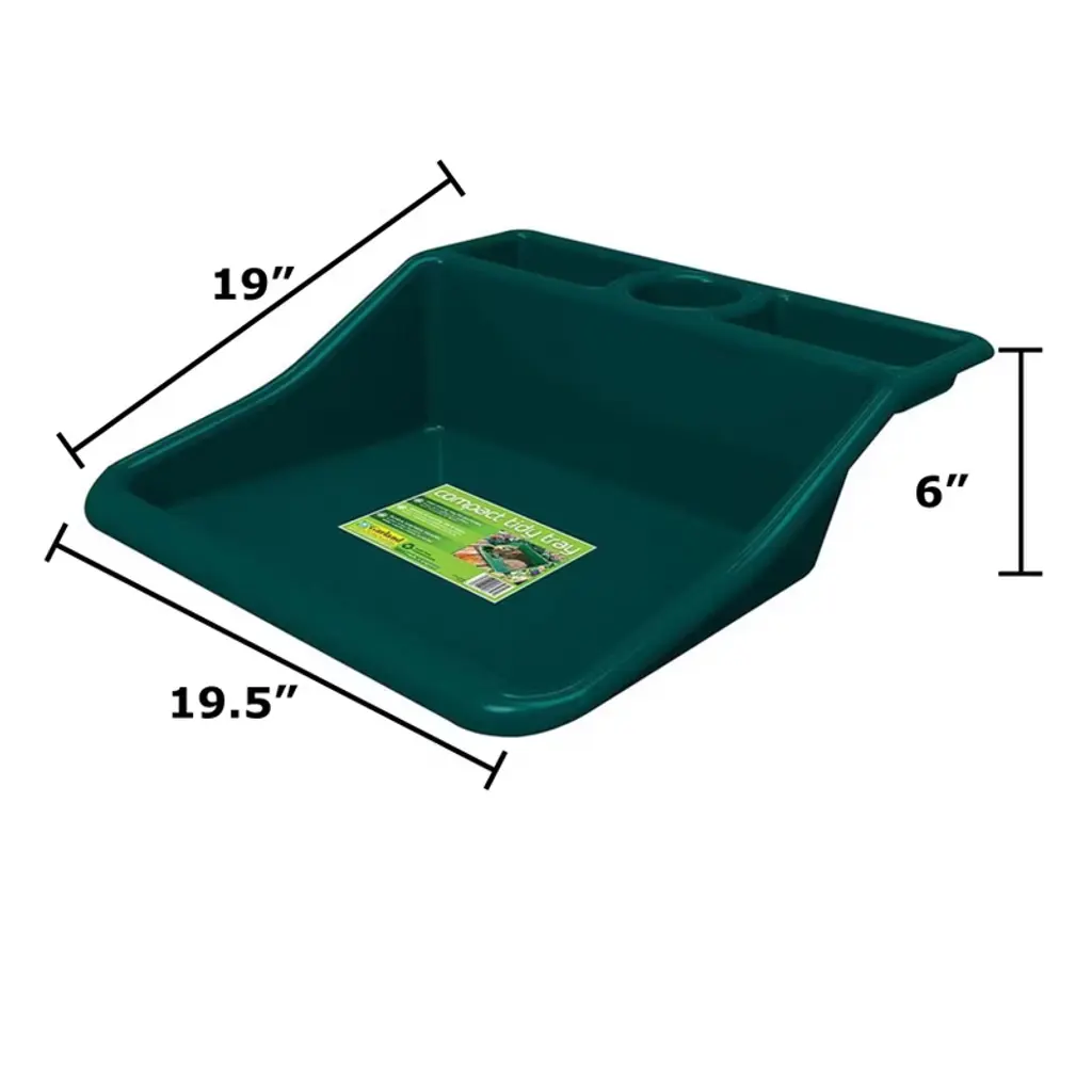 This Compact Tidy Tray is a durable, one-piece tray designed for versatility. Featuring an integral shelf, it is an essential accessory for potting, mixing, and growing plants. Lightweight and easy to use both indoors and outdoors, it measures 19" L x 19.5" W x 6" H and weighs just 2 lbs. Made from 100% recycled plastic, it is available in either black or green.