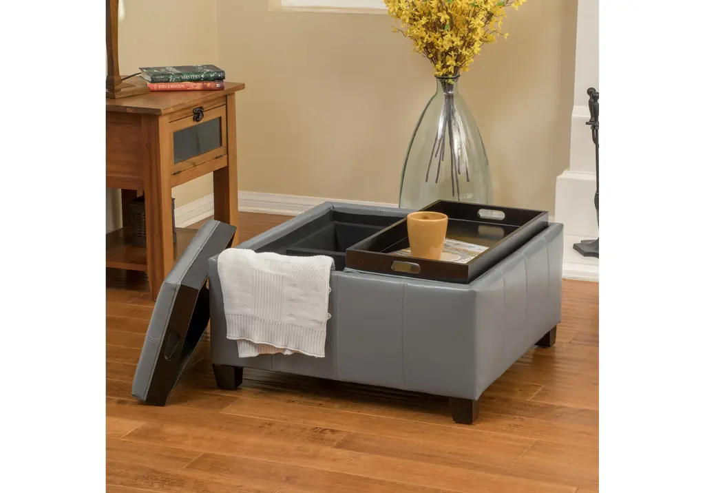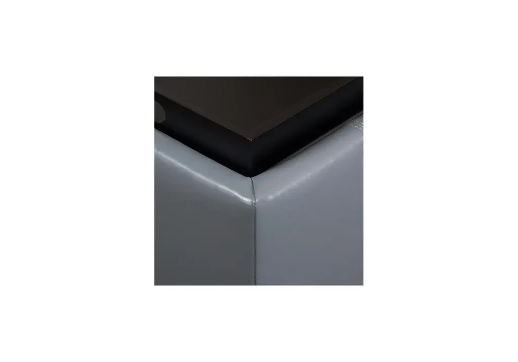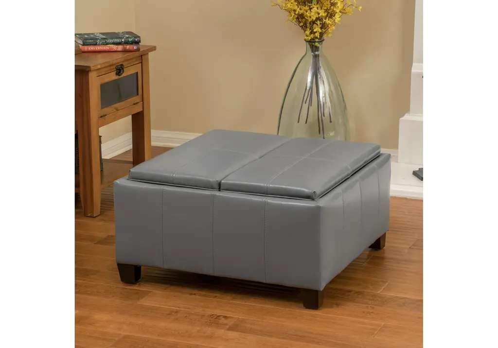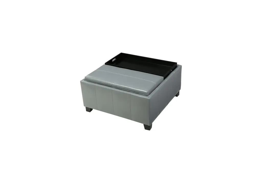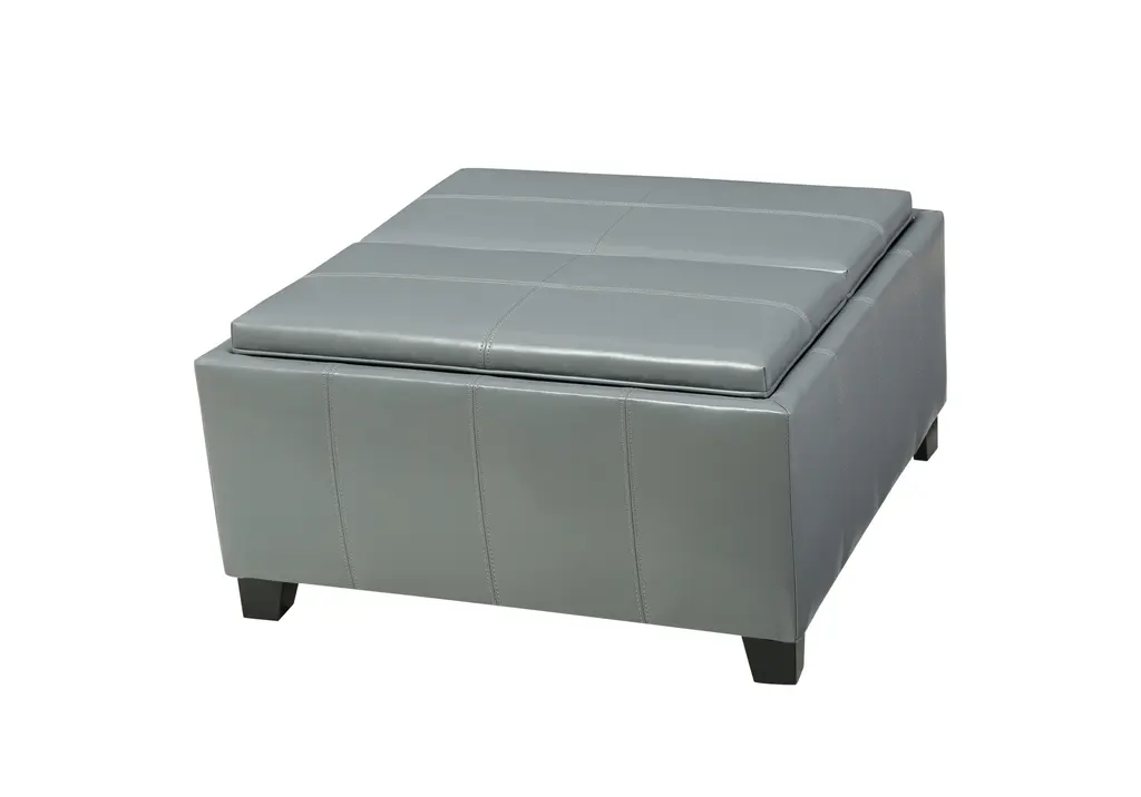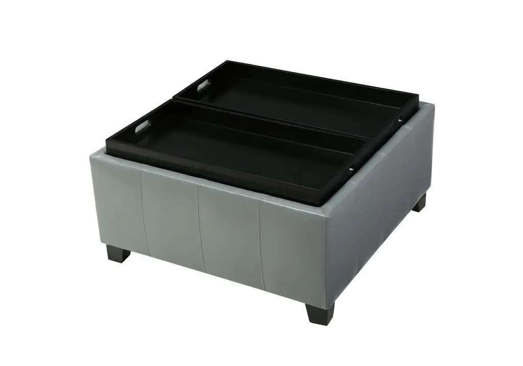 Put your feet up and have your drink too with a stylish and incredibly functional accessory. Featuring a gorgeous double stitch design and smooth upholstery, our ottoman brings a refined atmosphere to any home. This ottoman also offers ample storage space for all of your pillows and blankets and is topped with two useful tray tops for extra function. Whether you are using this as a coffee table or extra seating for an unexpected guest, our outstanding ottoman gives your home everything you need.CONTEMPORARY DESIGN: Featuring clean lines, smooth upholstery, and double stitch design, our storage ottoman offers the look, feel, and design of a truly contemporary piece. With a minimalistic yet refined structure, this set brings out a simplistic style that emphasizes comfort and functionality.TRAY TOP WITH STORAGE SPACE: This ottoman comes with ample storage space for all of your pillows and blankets. This comes two tray tops with a reversible option that allows you to easily transform this ottoman from a footrest or extra seat into a convenient table for your items. Finished with two handles, each tray top is incredibly mobile and painless to transport.UPHOLSTERED: Our ottoman is generously upholstered, giving any room a refined appearance. This provides a smooth, immaculate texture for this piece as well as a plush top for extra comfort.DIMENSIONS: Choose an accessory that is the perfect size for you and your furniture. This ottoman is 29.00'' W x 29.00'' D x 15.50'' H. You will love how much your space can transform with the simple addition of this charming ottoman.ASSEMBLY REQUIRED: Some assembly is required for this storage ottoman. All of the instructions and tools needed for assembly are included.Includes: One (1) Storage OttomanMaterial: Faux LeatherLeg Material: Birch WoodColor: GrayLeg Finish: Dark BrownHand-Crafted DetailsAssembly RequiredDimensions: 29.00 inches deep x 29.00 inches wide x 15.50 inches high