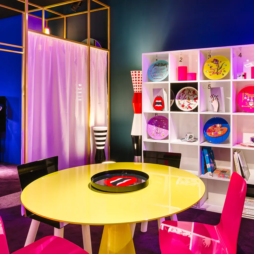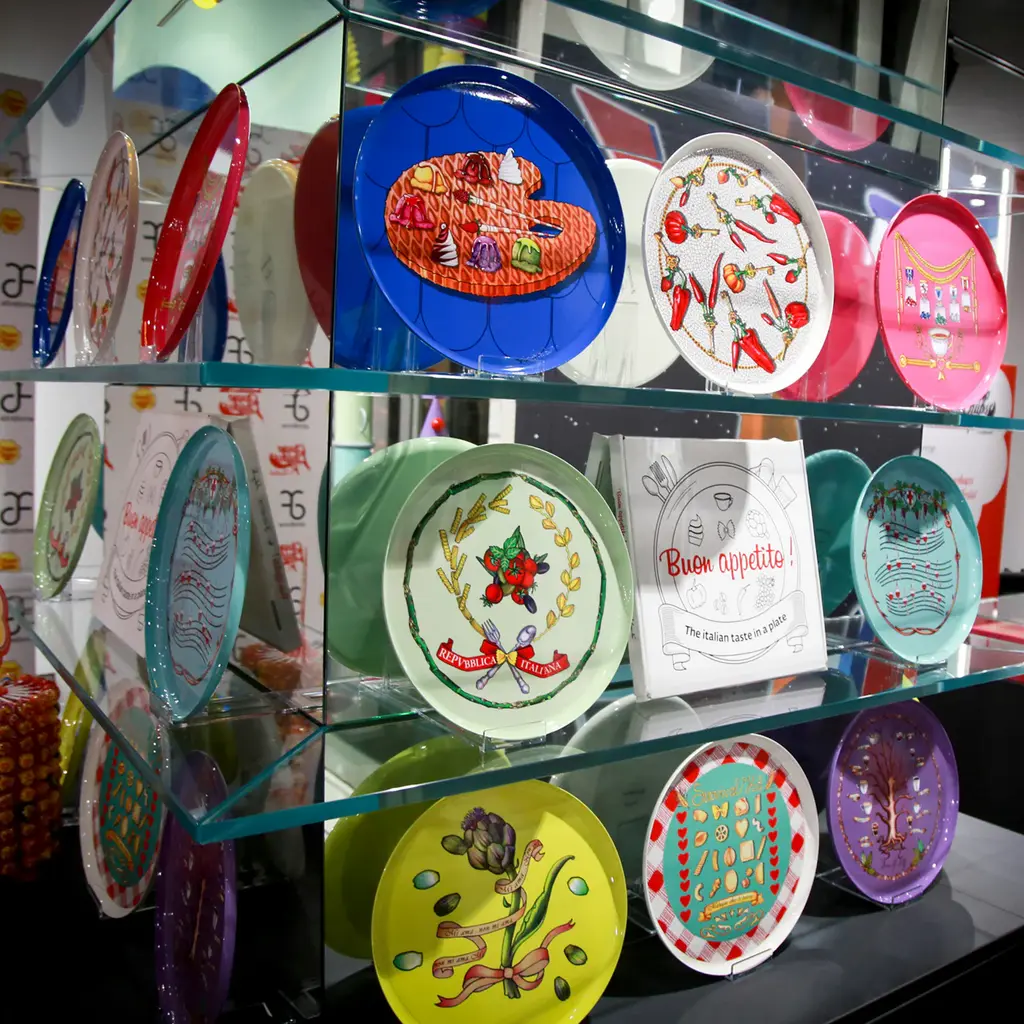 The "Gelati d'arte" tray from the "Buon Appetito!" collection features a vibrant and playful graphic design inspired by Italian culinary traditions. Created for Expo 2015, it showcases a whimsical palette-shaped waffle adorned with colorful gelato scoops and decorative elements. Designed by Silviya Neri, the tray combines vintage, modern, and surreal motifs, offering a distinctive serveware piece that celebrates the artistry of Italian flavors. An exclusive recipe is included to enhance the cultural experience.