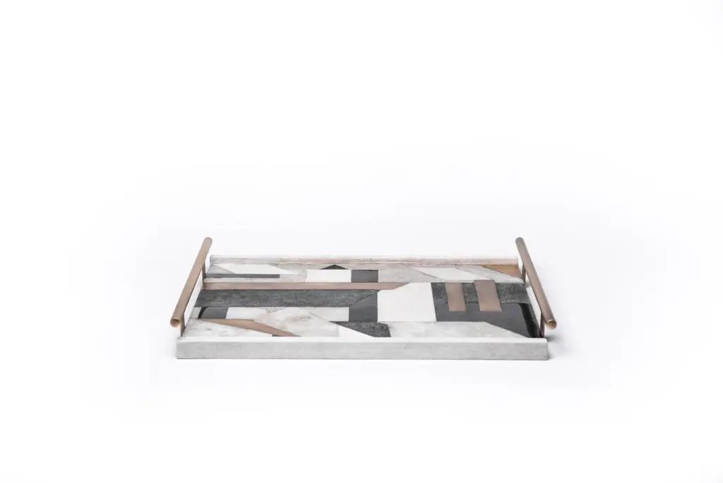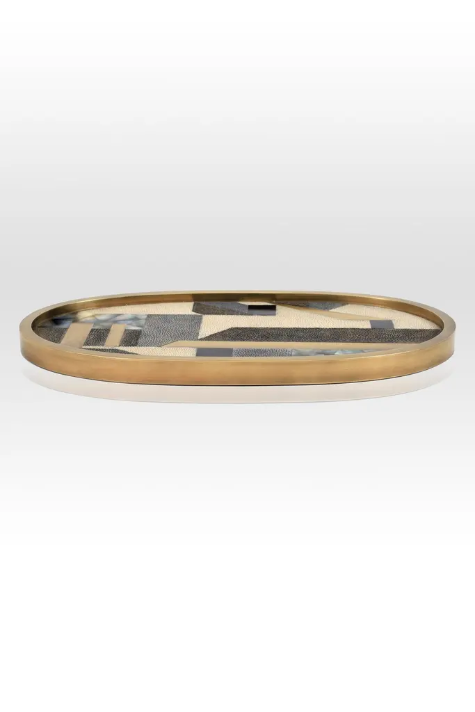 The Paris based label has distinguished themselves since their launch, with their iconic use of shagreen mixed with brass and other exotic materials. All furniture is handcrafted by skilled artisans, ultimately making each piece unique, designed in Paris and produced in the Philippines.A classic rectangle tray revisited; this Kifu Paris geometric tray inlaid in a mixture of shagreen, shell and bronze-patina brass, makes for a stunning tabletop piece in any space. The brass handle are tubular. in Available in other sizes & finishes and an oval shape.The dimensions of this piece are 43 x 30.5 x 5 cm All Kifu Paris pieces are handmade by artisans, ultimately making each piece unique.Custom color/sizing available on request.Wipe clean with soft dry cloth.Although inspired by her parents, her collection of Home Accessories and Furniture is a distinct identity of its own. Kifu uses handmade techniques of elaborate inlay patterns of shagreen, shells, semi-precious stones, materials she experienced as a child growing up in her parent’s studio, but interpreted in a younger quirkier way reflecting her youth. From her "jewelry inspired knobs" on decorative boxes, gold bar boxes and an extravagant inlay pattern mix of shagreen and shell inspired by galactic constellations, as seen on her enormous round mirror, is refreshing to see. Kifu embodies whimsical elements throughout her collection and is not afraid to be daring and unexpected in her approach to design. All shagreen-covered items should be kept out of direct sunlight, color variants may occur on the stingray and other exotic finishes, but this showcases the Parisian label's commitment to creating authentic luxurious products using natural components.
