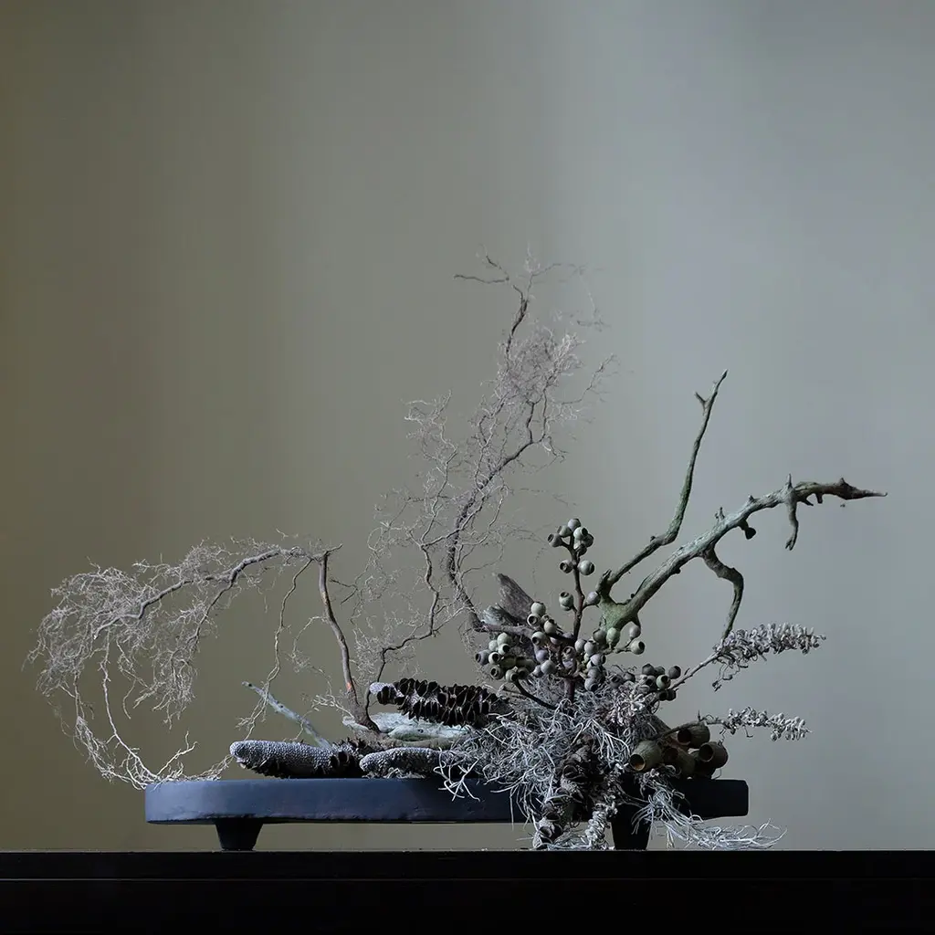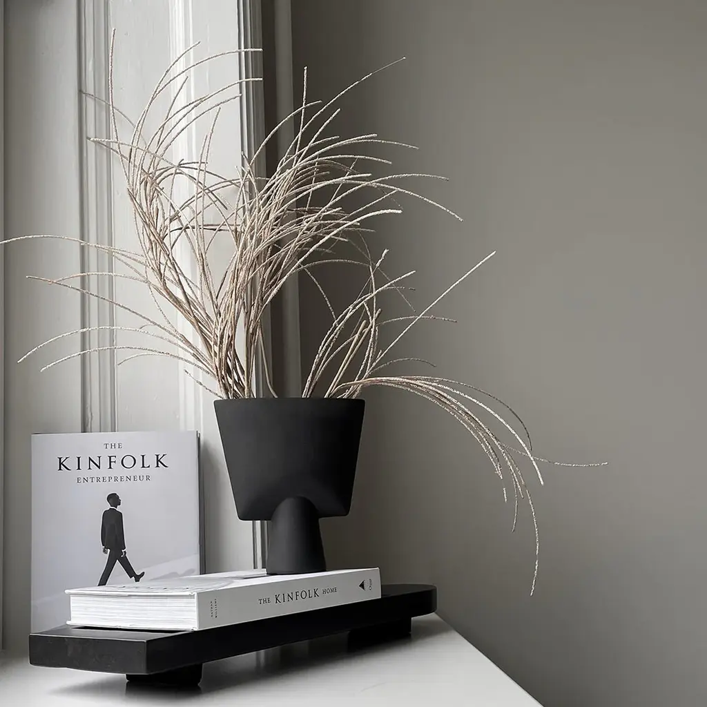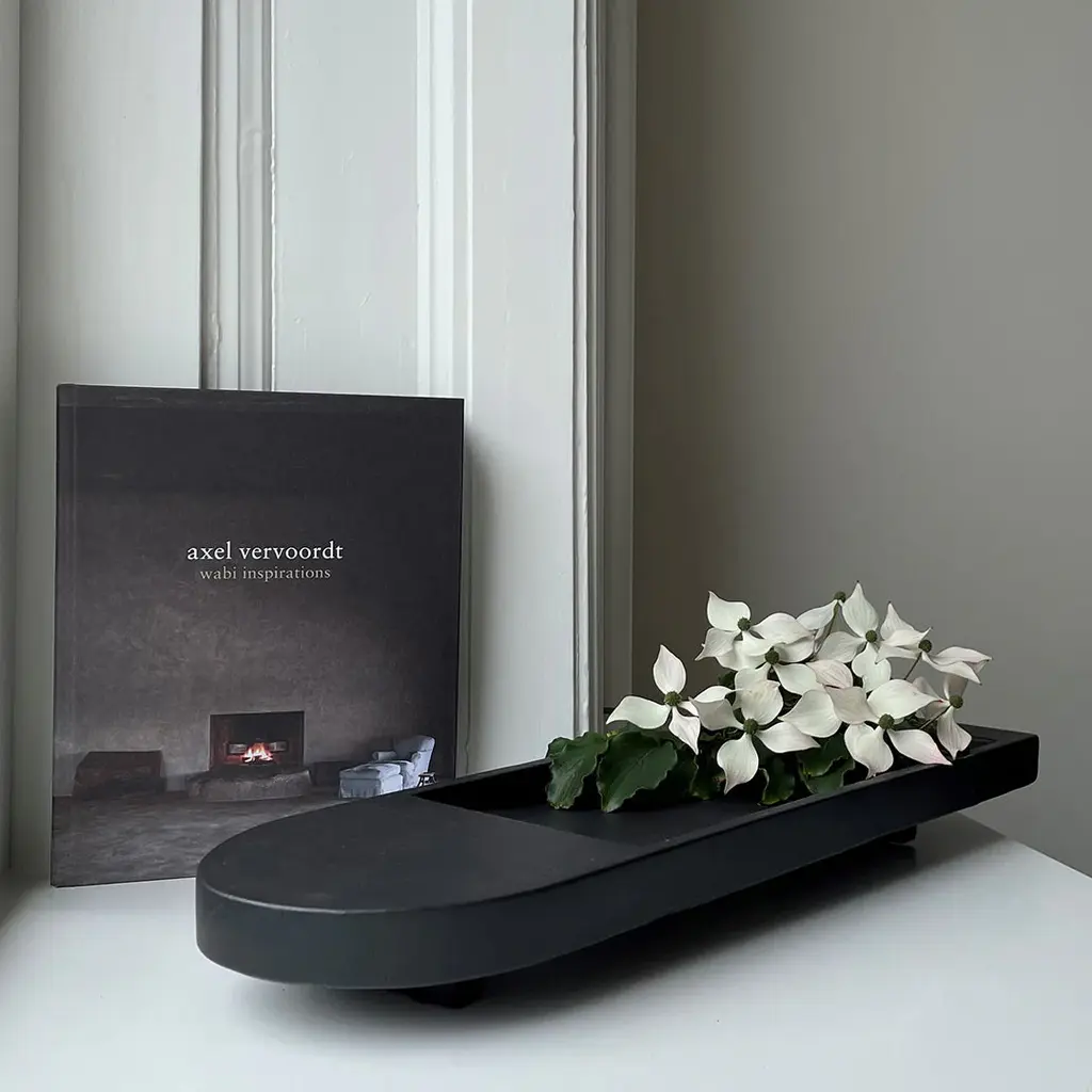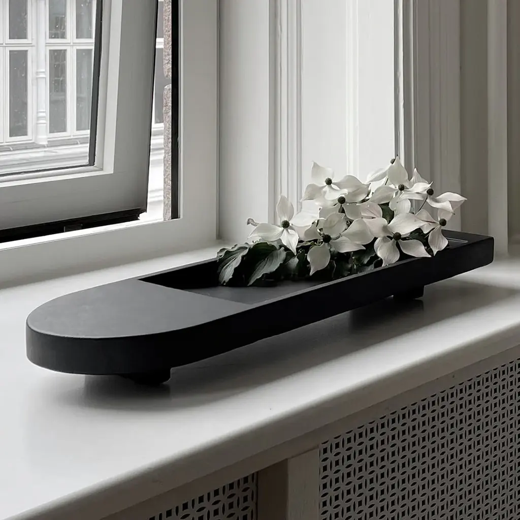 The Geta Tray is inspired by Japanese decoration trays, where the platform is elevated above the table surface, highlighting a specific object or decoration piece. The name is a reference to the classic Japanese Geta shoes with two prongs. It is cast in solid fiber concrete to add a certain heaviness, while also creating a unique and refined texture. Geta can be used for various decorative purposes or stand alone as a statement piece in itself. As it is a hand glazed natural product, the colours may vary slightly and it is not waterproof safe. Designed by Kristian Sofus Hansen & Tommy Hyldahl Made of fiber concrete.