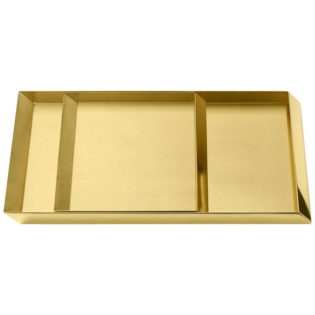 Trays in brass. Dimensions for trays: 35.4 x 23 x 2H cm; 23.5 x 7.5 x 2H cm; 12.5 x 7.5 x 2 H cm.