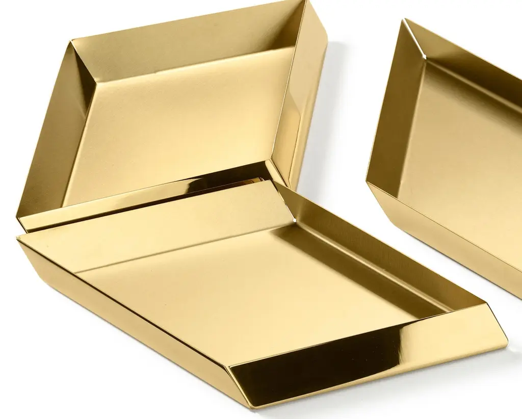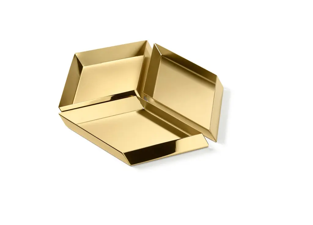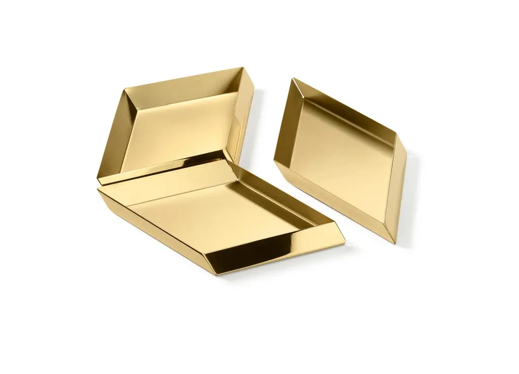 The compositional scheme of this family of small trays is the axonometric isometric projection of two parallelepipeds which creates a three-dimensional optical effect implemented by inclined edges and by contrasting metal finishes. Like in a game, you can get as many configurations as you wish, always creating different designs.Materials:Brass.