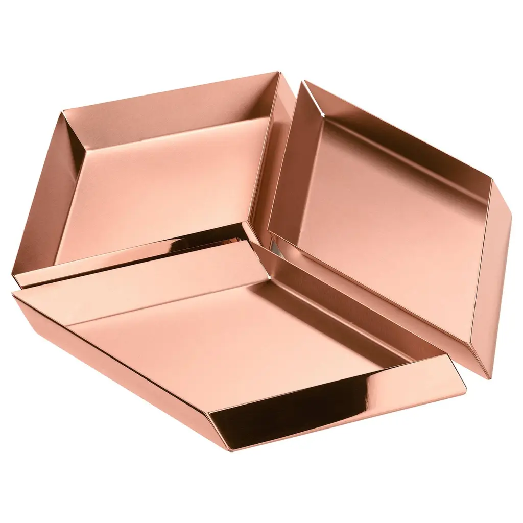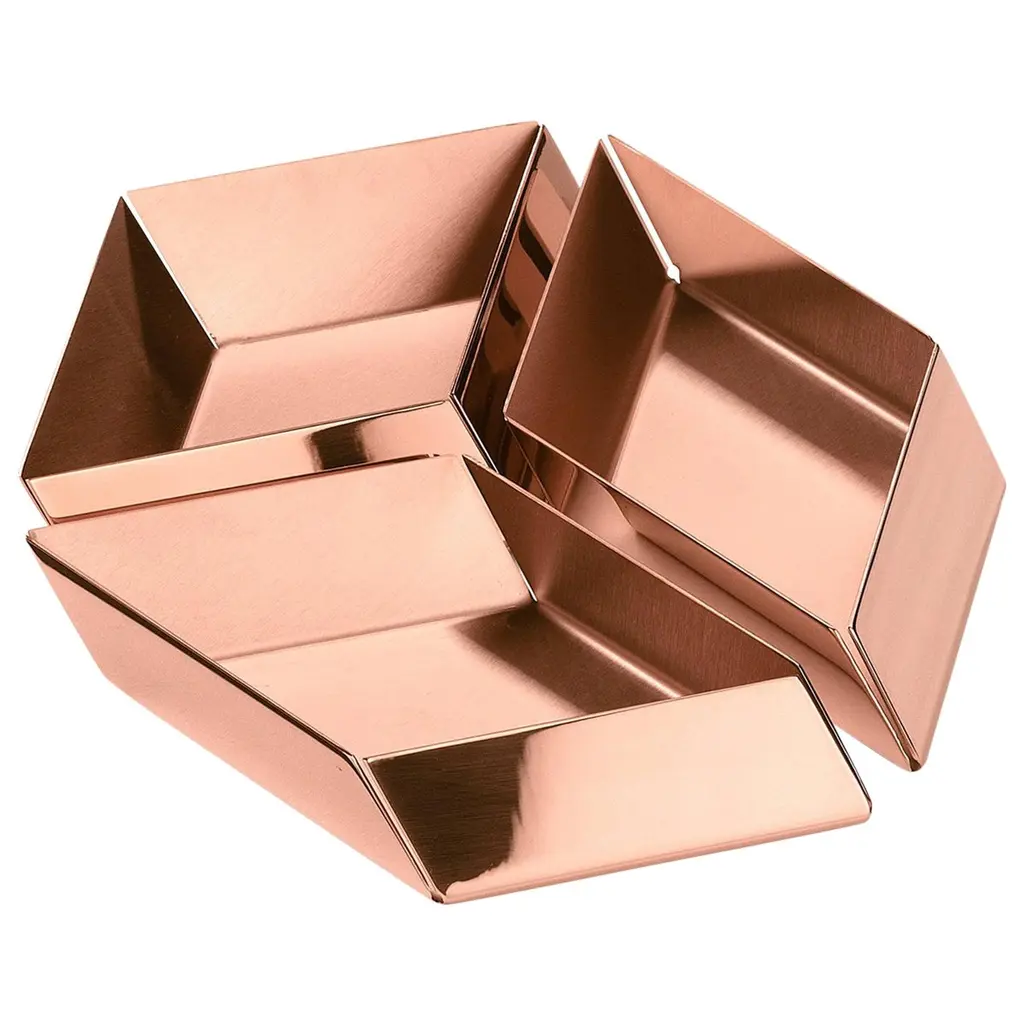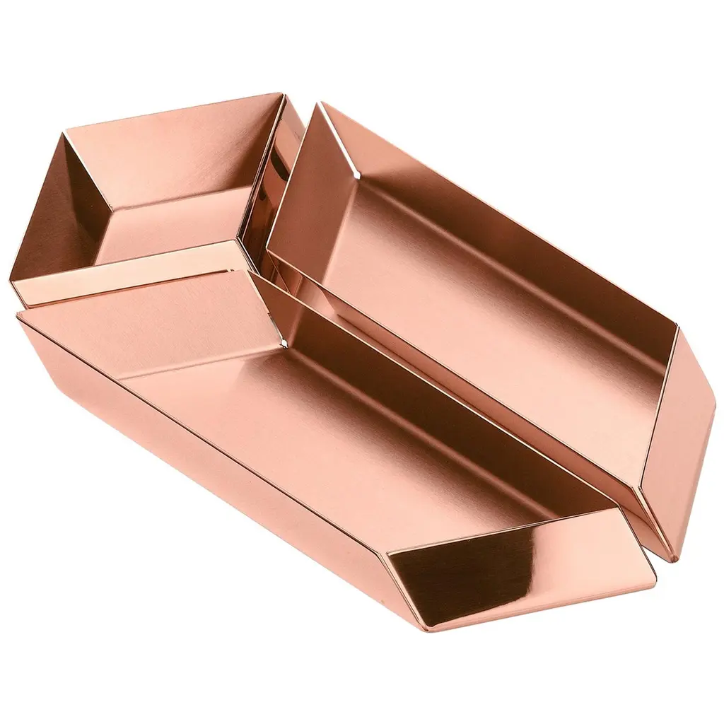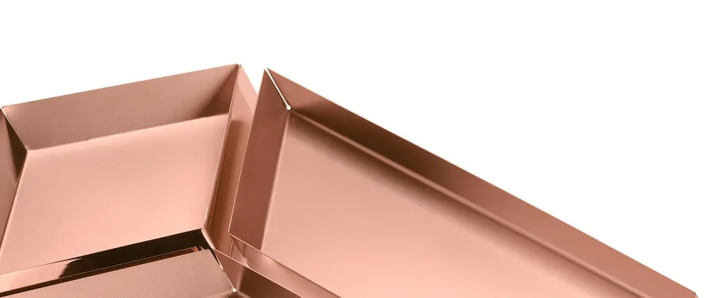 The compositional scheme of this family of small trays is the axonometric isometric projection of two parallelepipeds which creates a three-dimensional optical effect implemented by inclined edges and by contrasting metal finishes. Like in a game, you can get as many configurations as you wish, always creating different designs.Materials:Copper.