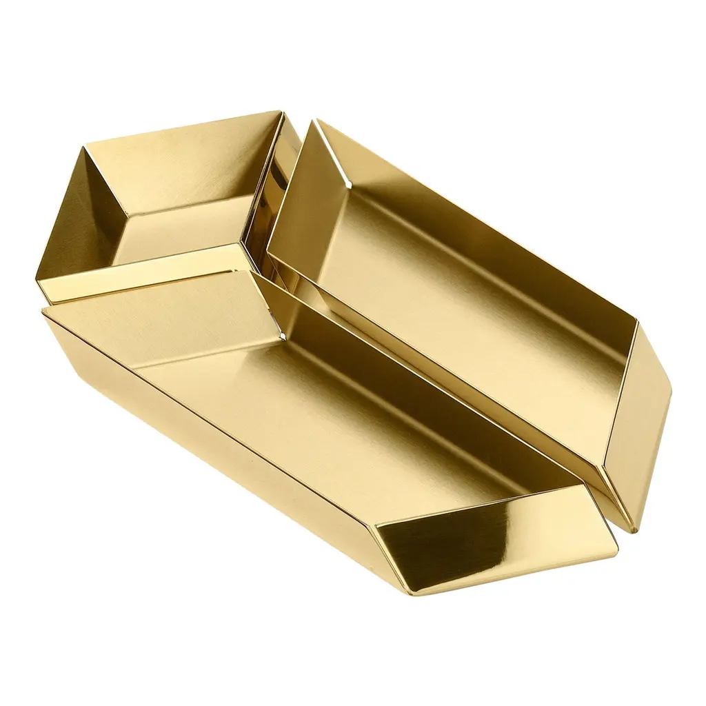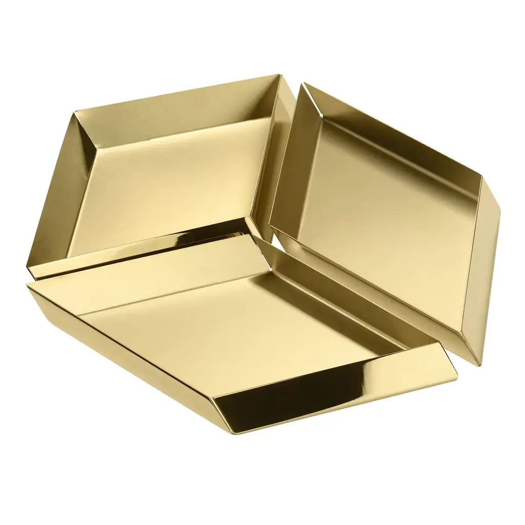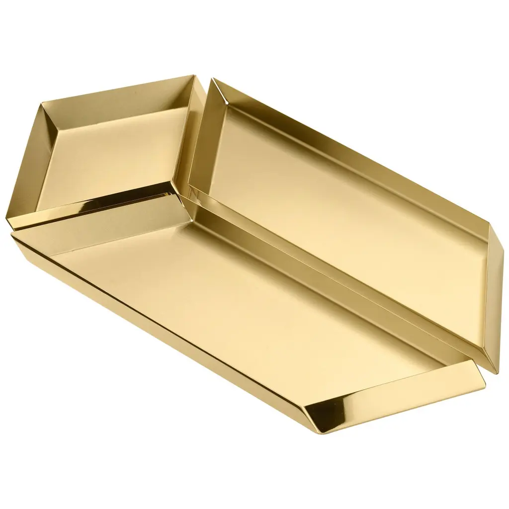 The compositional scheme of this family of small trays is the axonometric isometric projection of two parallelepipeds which creates a three-dimensional optical effect implemented by inclined edges and by contrasting metal finishes. Like in a game, you can get as many configurations as you wish, always creating different designs.Materials:Copper.