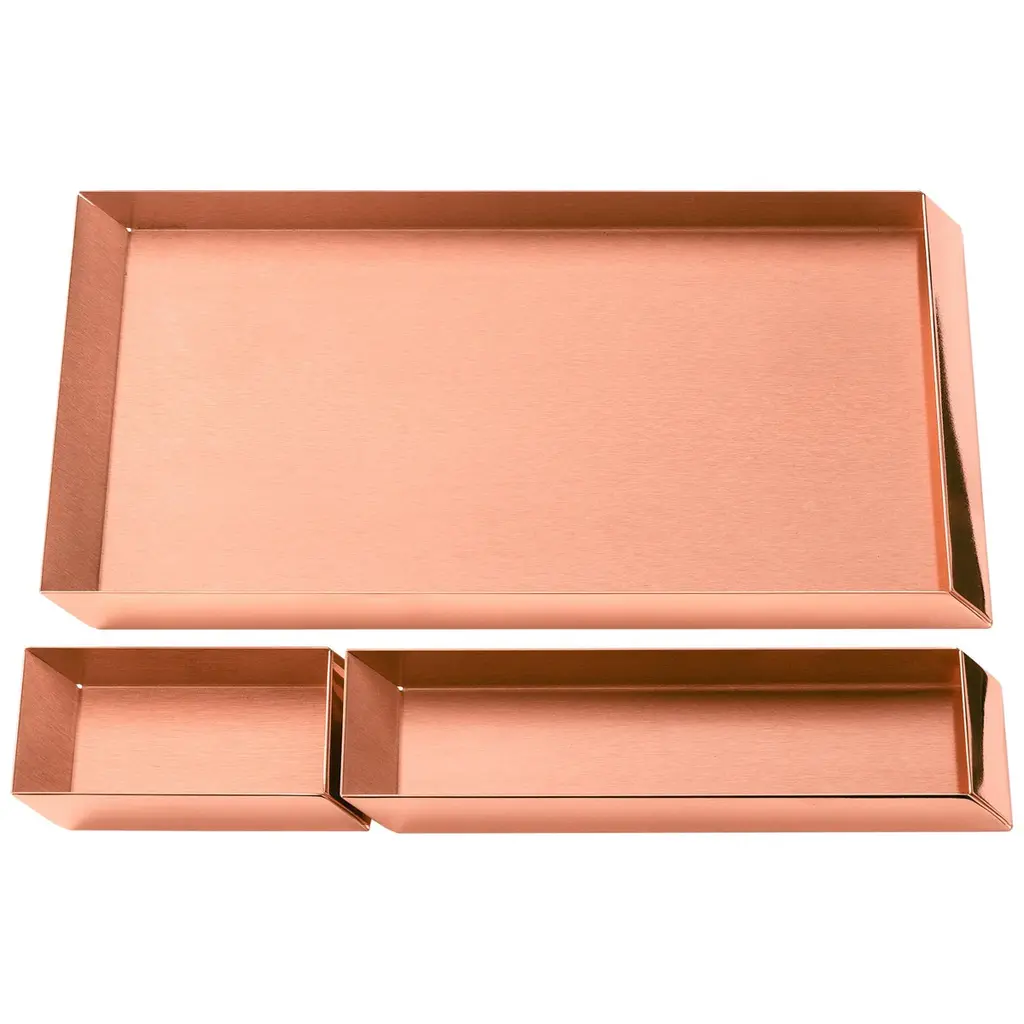 Trays in copper with a rose gold finish. The compositional scheme of this family of small trays is the axonometric isometric projection of two parallelepipeds which creates a three-dimensional optical effect implemented by inclined edges and by contrasting metal finishes. You can form as many configurations as you wish, always creating different designs. Dimensions for trays: 34.5 x 7.5 x 2 H cm; 23.5 x 7.5 x 2 H cm; 12.5 x 7.5 x 2 H cm.