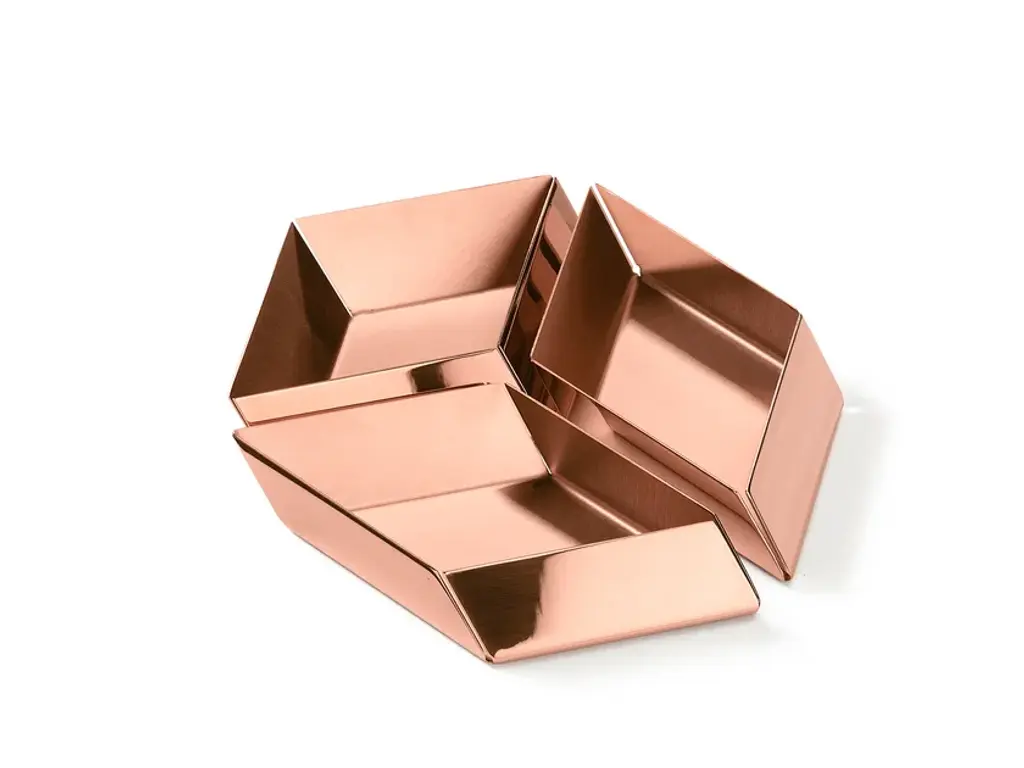Trays in copper with a rose gold finish. The compositional scheme of this family of small trays is the axonometric isometric projection of two parallelepipeds which creates a three-dimensional optical effect implemented by inclined edges and by contrasting metal finishes. You can form as many configurations as you wish, always creating different designs.