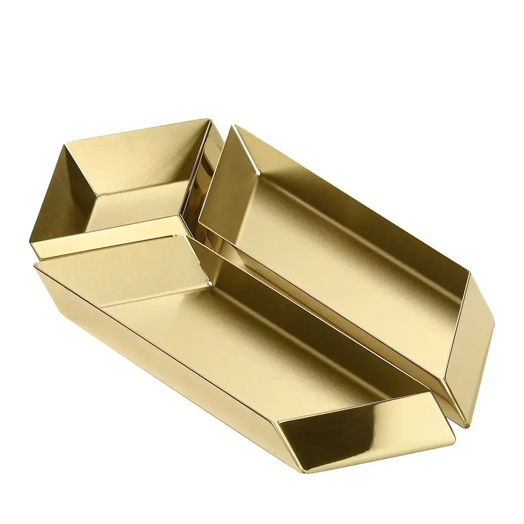 Trays in polished brass. The compositional scheme of this family of small trays is the axonometric isometric projection of two parallelepipeds which creates a three-dimensional optical effect implemented by inclined edges and by contrasting metal finishes. You can form as many configurations as you wish, always creating different designs.