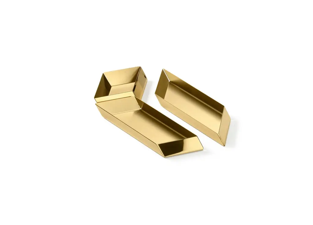 The compositional scheme of this family of small trays is the axonometric isometric projection of two parallelepipeds which creates a three-dimensional optical effect implemented by inclined edges and by contrasting metal finishes. Like in a game, you can get as many configurations as you wish, always creating different designs.Materials:Brass.