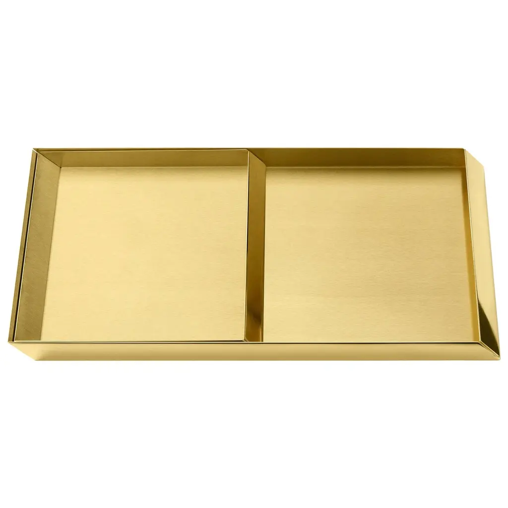 Trays in copper with a rose gold finish. The compositional scheme of this family of small trays is the axonometric isometric projection of two parallelepipeds which creates a three-dimensional optical effect implemented by inclined edges and by contrasting metal finishes. You can form as many configurations as you wish, always creating different designs. Dimensions for trays: 45 x 27.5 x 2.5H cm; 27 x 22.5 x 2.5 H cm.