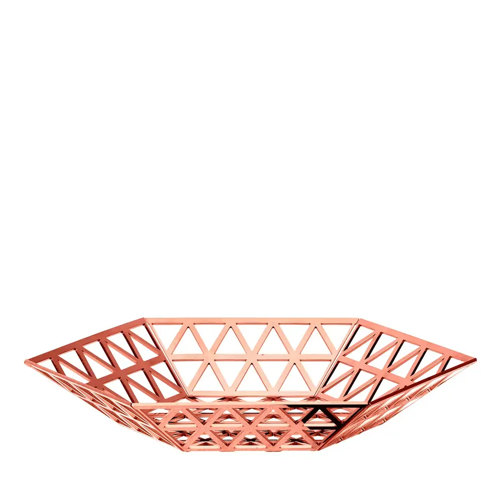 Flat tray in openwork steelWhen you look at the top view of the Tip-Top series, all the triangles have the same size. In 3D these triangles have been stretched, which creates a very surprising hexagonal structure, applied to different functions.Material:24-karat gold-plated stainless steel.