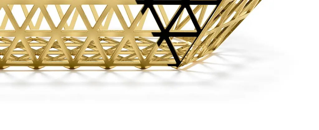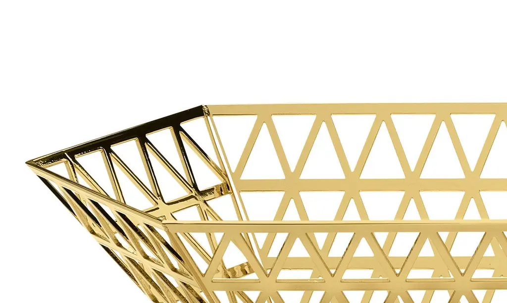 Limousine tray in stainless steelWhen you look at the top view of the Tip-Top series, all the triangles have the same size. In 3D these triangles have been stretched, which creates a very surprising hexagonal structure, applied to different functions.Material:24-karat gold plated stainless steel.