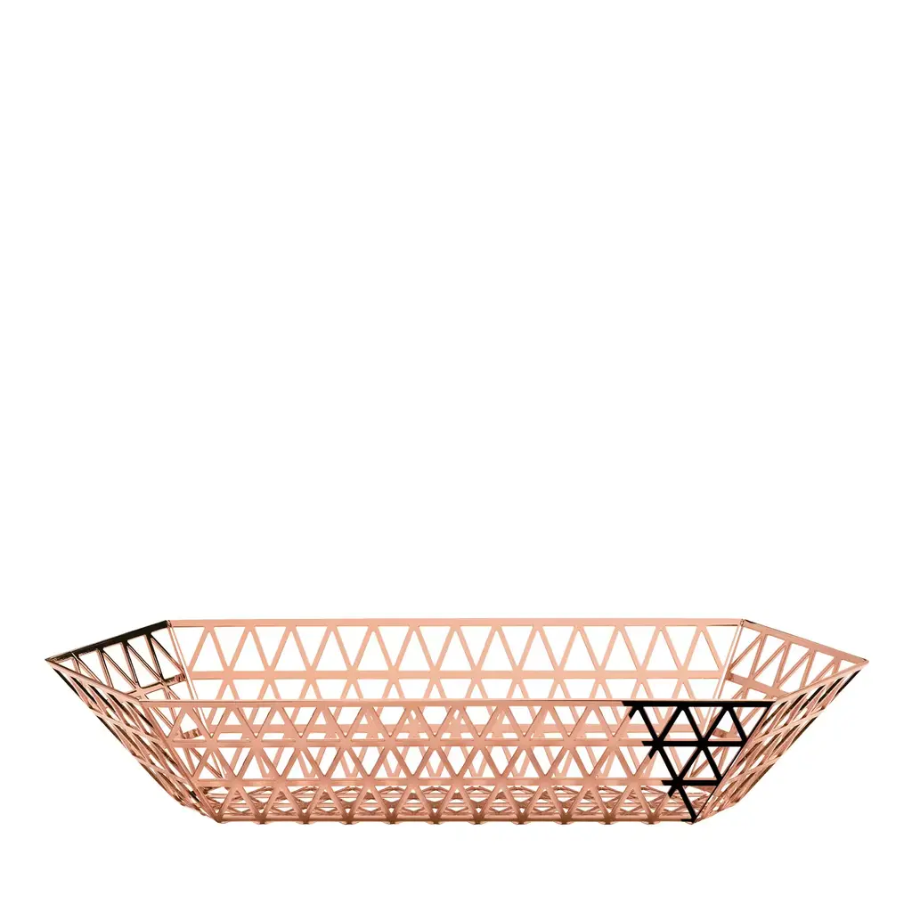 This exquisite tray is part of the Tip Top collection and was entirely made in stainless steel that was then given a copper finish and its pink-like glow. This worm hue adds a gentle accent to the rigorous structure of the tray, which creates a hexagonal silhouette with a repetition of triangles over its base and sides. Ideal for a centrepiece for a dining table or to store and display small objects or food.