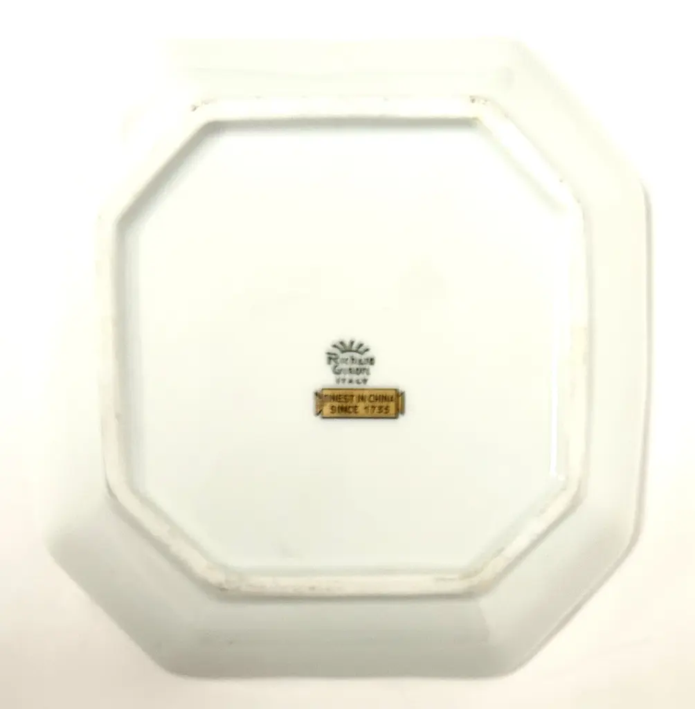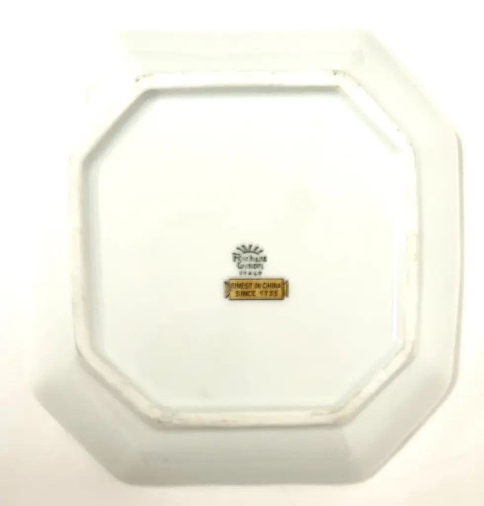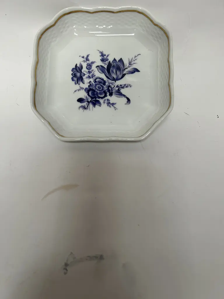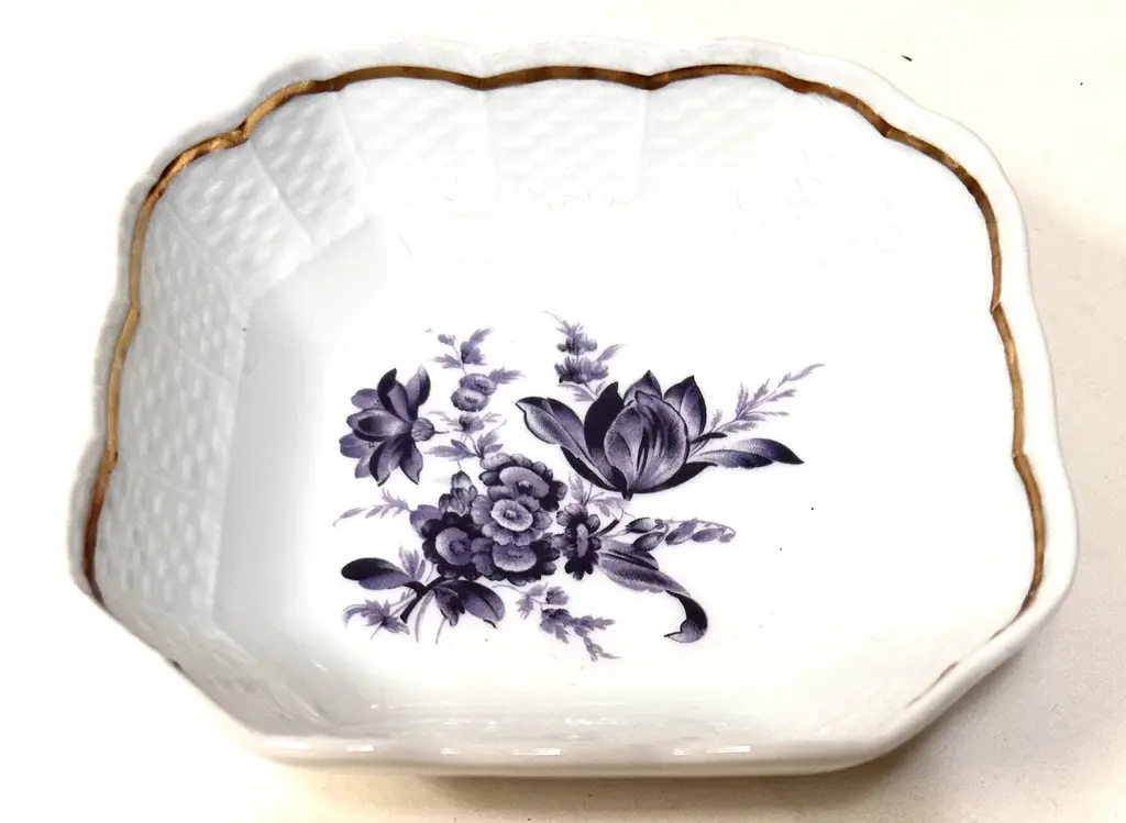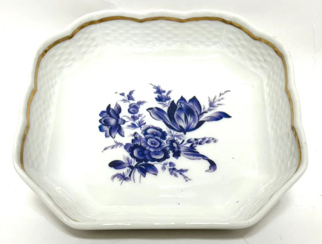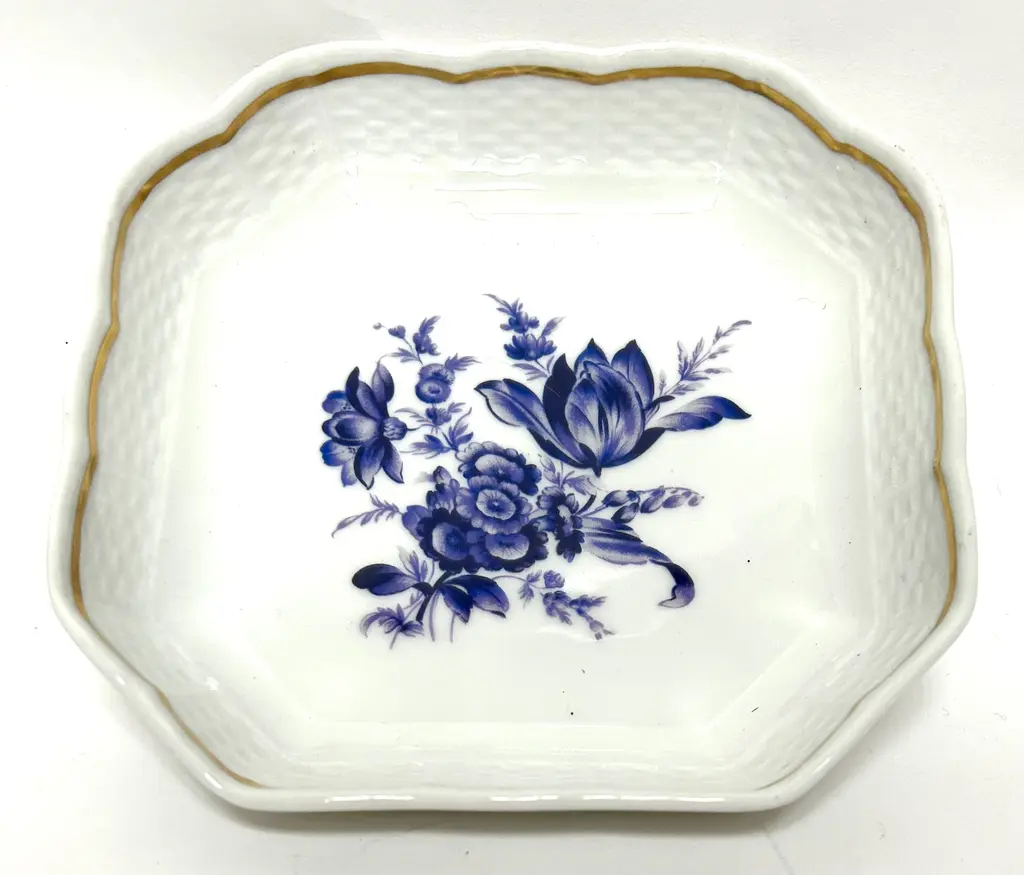 Elegant Richard Ginori Italian gilt porcelain vide poche tray boasts a big beautiful blue tulip and other flowers. Lovely basket weave pattern impressed into the porcelain borders, framed by gold rims. Classic scalloped edges. Lovely Marked “Richard Ginori Italy.”