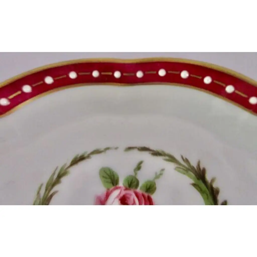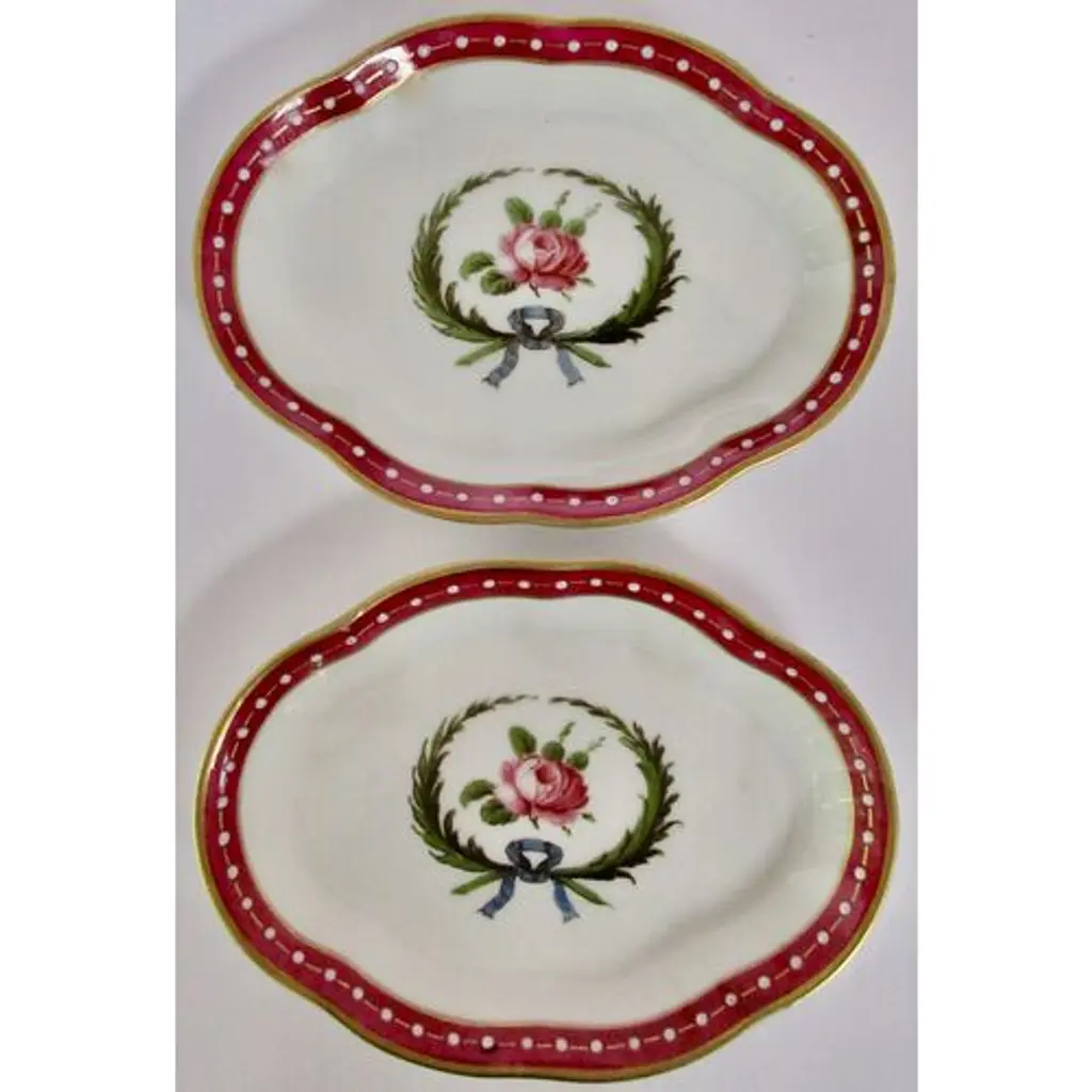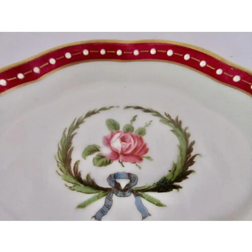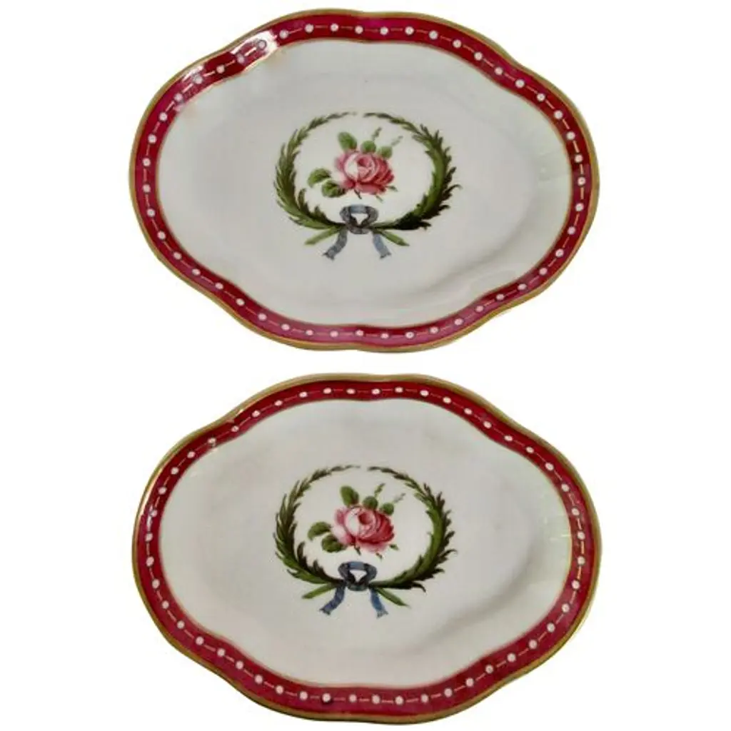 Pair of Richard Ginori Italian porcelain dishes with exquisite central rosebud images enrobed by beribboned laurel leaf crests. White-dotted raspberry borders with gilded inner borders and rims. Marked "Richard Ginori" with marks used by the company from 1920 through 1950.