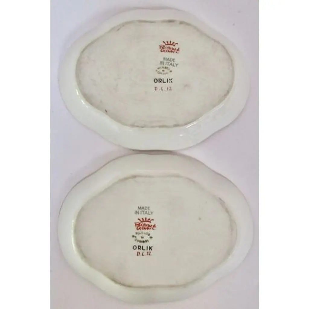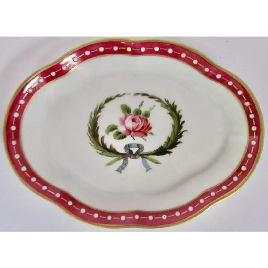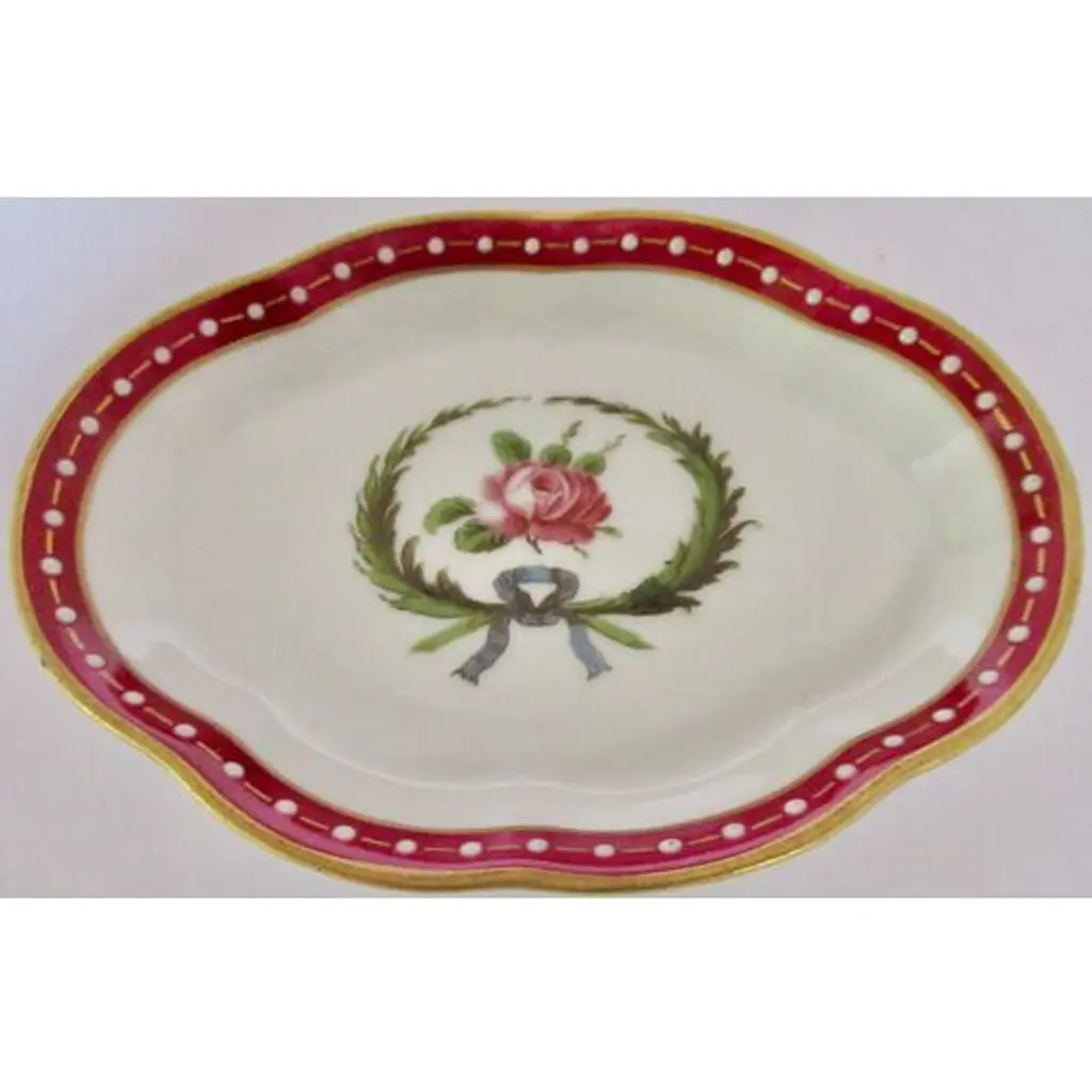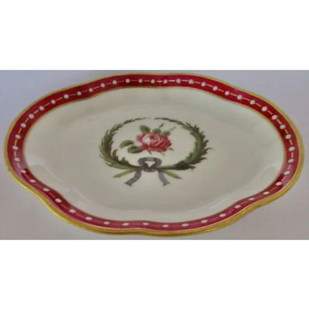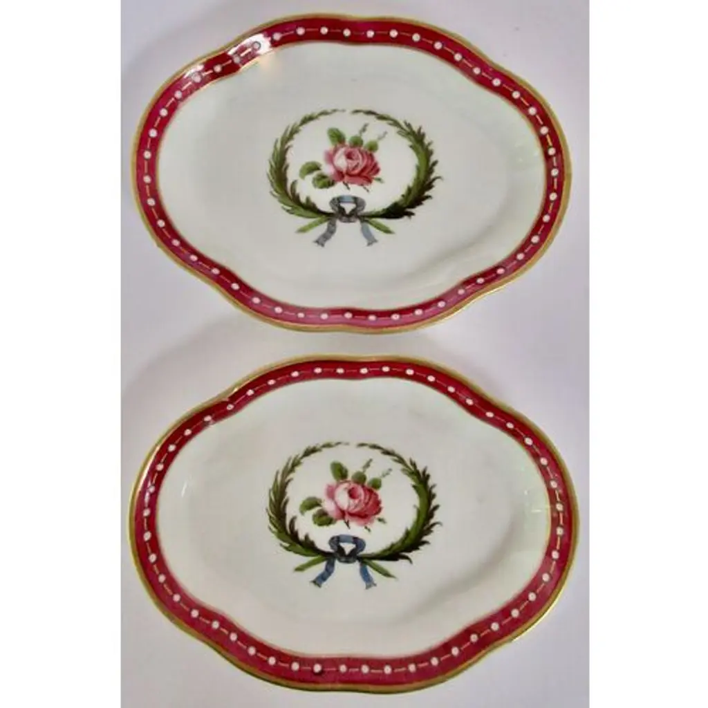 Pair of Richard Ginori Italian porcelain dishes with exquisite central rosebud images enrobed by beribboned laurel leaf crests. White-dotted raspberry borders with gilded inner borders and rims. Marked "Richard Ginori" with marks used by the company from 1920 through 1950.