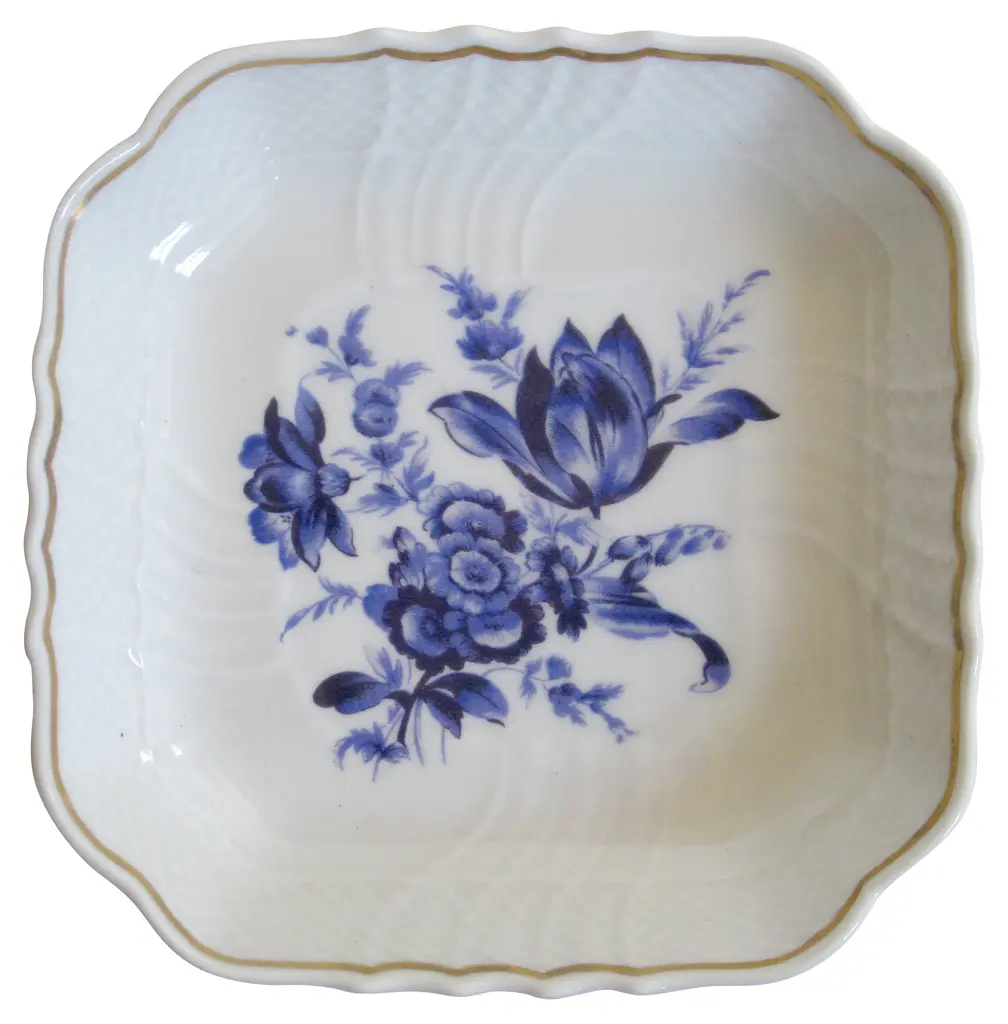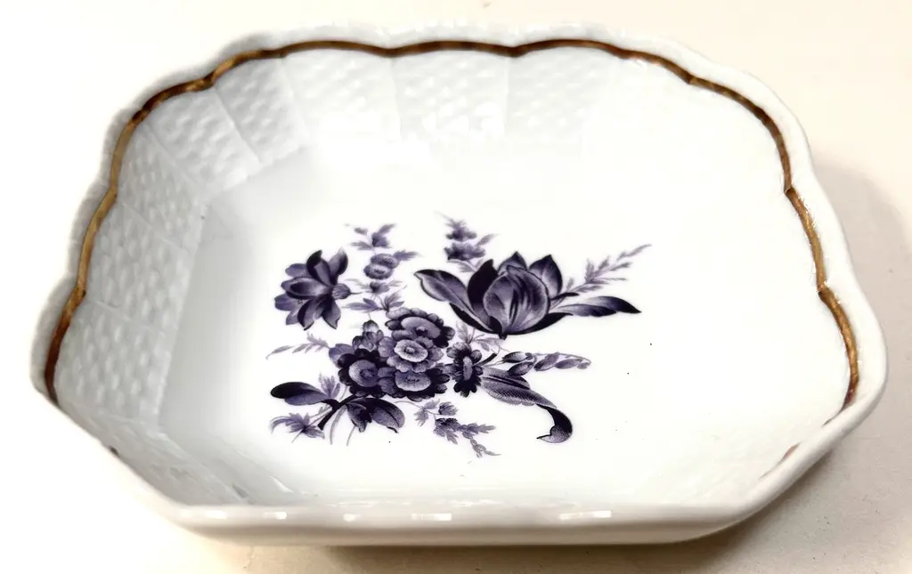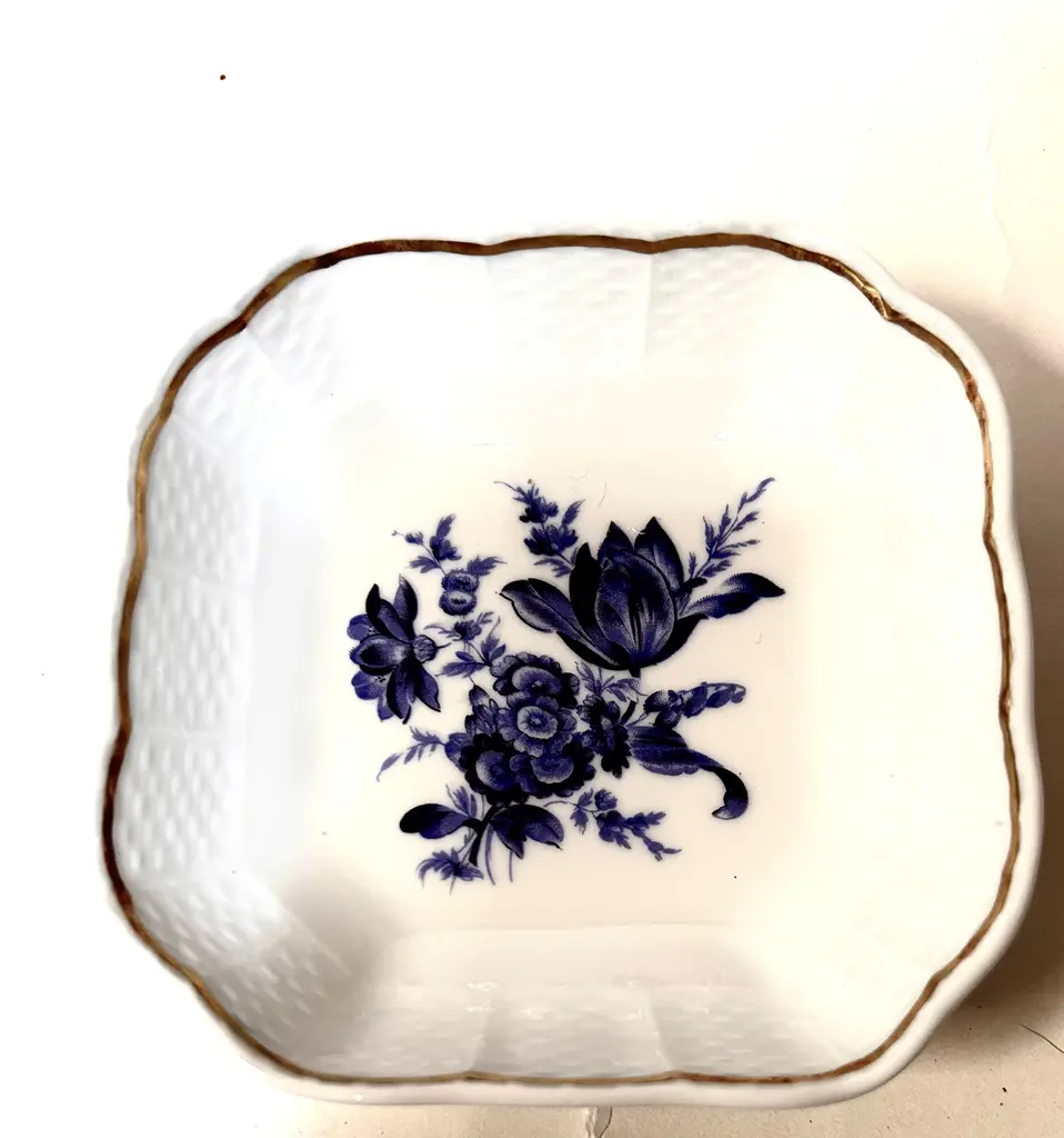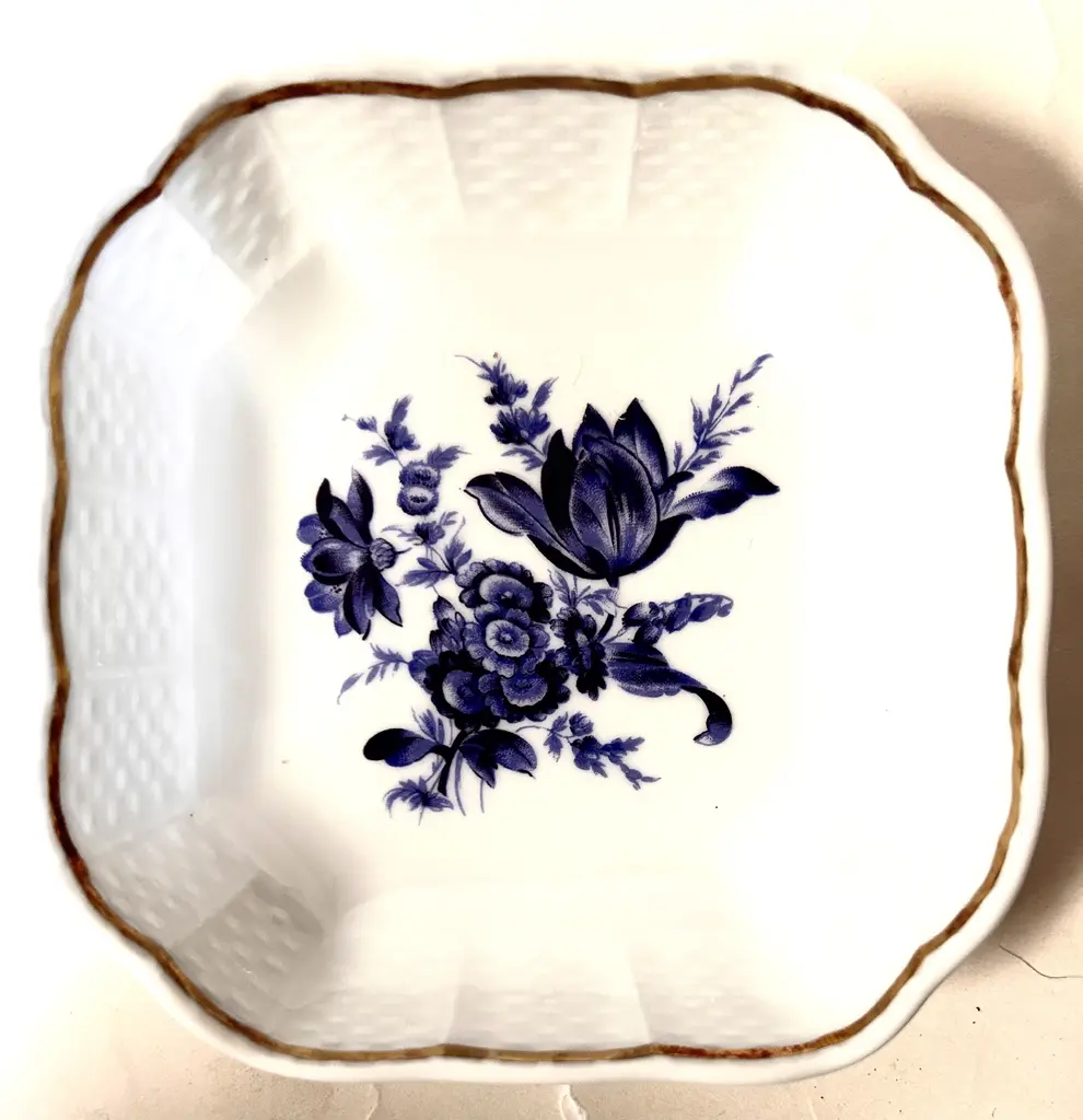 Richard Ginori Italian gilt porcelain tray with a beautiful blue tulip and other blooms, basket weave border design, and gilt rim. Marked “Richard Ginori Italy.”