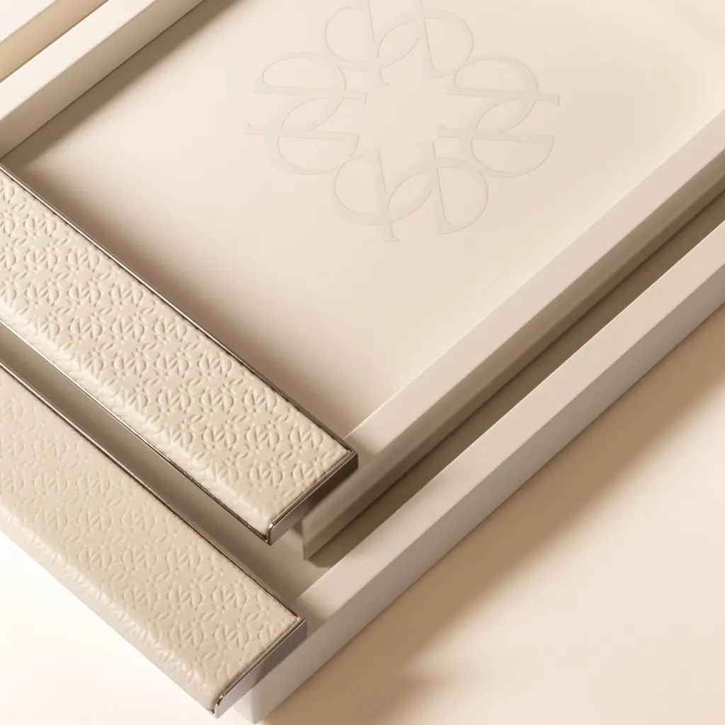 A masterful fusion of haute couture and artisanal design, the Giobagnara x Elie Saab Ecusson Tray is a stunning creation that brings the unmistakable elegance of the runway to the art of entertaining. Expertly handcrafted in Italy, this piece features a flawless, high-gloss lacquered wood body with a subtly carved monogram. The handles are a statement of pure luxury, wrapped in padded leather embossed with the ELIE SAAB Monogram pattern, and finished with brilliant palladium details. Highlights: