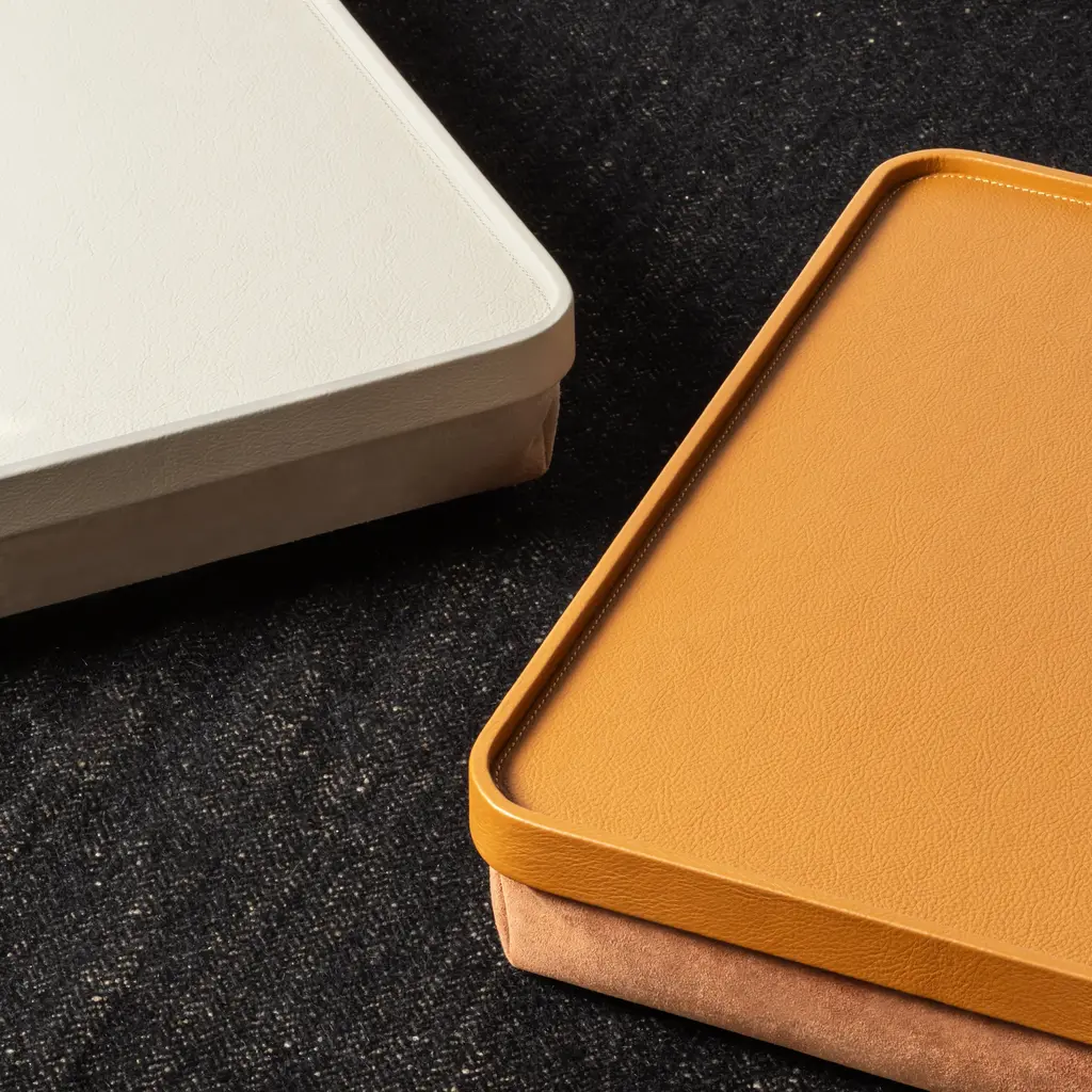 A landmark collaboration between two titans of Italian luxury, the Giobagnara x Poltrona Frau Laptop Tray creates the ultimate personal workspace. Expertly handcrafted in Italy, its top surface is enveloped in Poltrona Frau's world-renowned Pelle Frau® ColorSphere® leather. For perfect stability and comfort, the underside features a soft suede cushion with a microbead filling that conforms to your lap. It’s a seamless fusion of ergonomic design and uncompromising quality, transforming any seat into a first-class experience. Highlights:
