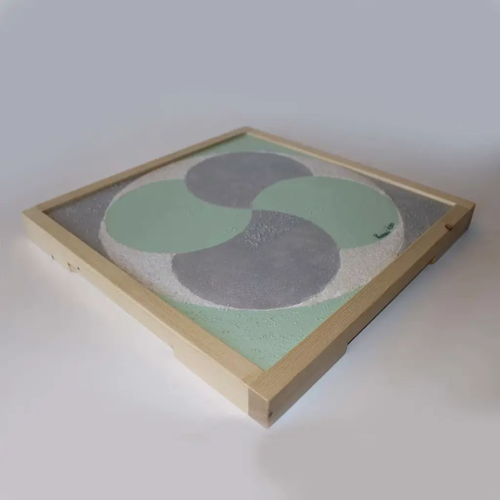 Dynamic and alluring, this square tray boasts a simple, geometric design and soft colors to create a visually striking work of art. Handcrafted of red fir, this tray is decorated by hand using water-based, non-toxic paint and features a geometric pattern of cool white and pastel teal circles that alternate and overlap on an off-white circle, creating an intense visual effect. Part of a limited series of only 20 signed pieces, this is the perfect housewarming gift as it will elevate a modern or traditional home with its unique, refined character.