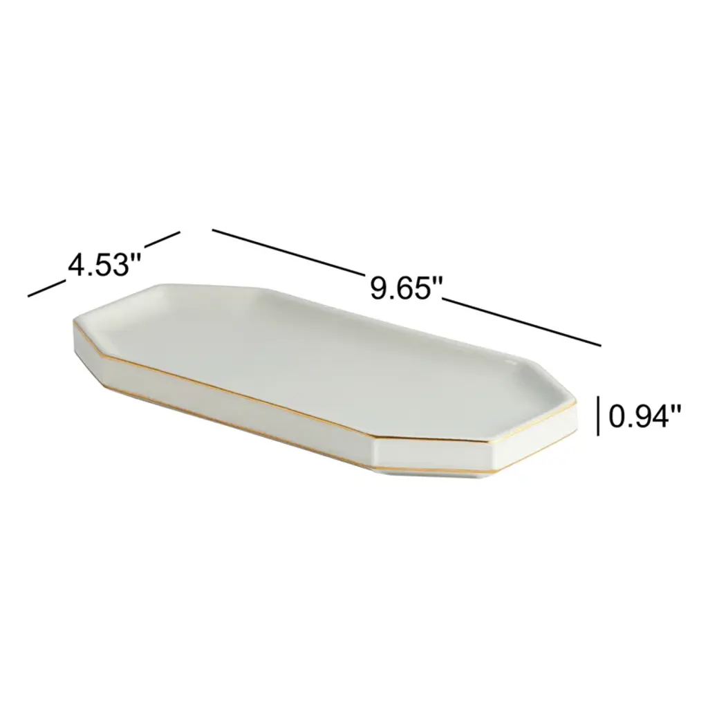 Add an effortlessly elevated accent to your bath or powder room with this angular accessory tray. It's crafted from porcelain in a glossy off-white hue, and it features golden trim along the edges for a pop of glam. This piece is sized just right for keeping your rings and accessories safe while you wash your hands, and its mildew-resistant design makes it a breeze to clean. Plus, it doubles as an unexpected soap dish.