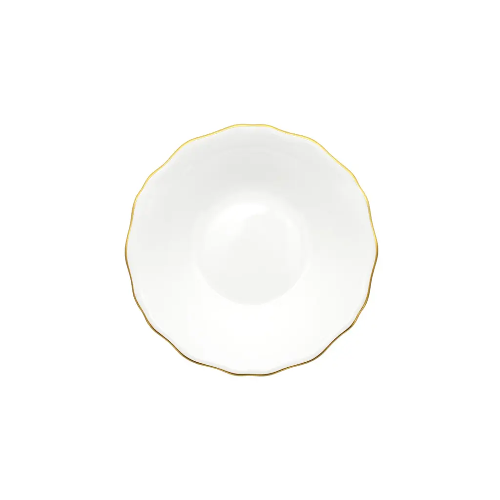 Created for Count Hadik in the early twentieth century, the classic style of Golden Edge celebrates this noble Hungarian family. Janos Hadik served as the president of Herend Porcelain from 1926 to 1933. Hand painted in Hungary. Now the biggest porcelain manufactory in Europe, Herend was founded in 1826 to produce earthenware in the small Hungarian village for which it was named. At the time, Hungary was flooded with low-cost pottery, but in 1839, Mor Fischer became the Manufactory’s new owner and he decided to focus on producing dinnerware replacement pieces for Europe’s royal families to complement their valuable porcelain patterns from Germany and the Far East. As his client base grew, Fischer commissioned his artists to begin designing dinnerware patterns of their own. Queen Victoria’s 1851 purchase of a large set for Windsor Castle was a milestone, setting the stage for aristocrats throughout Europe to clamor for Herend in their estates. In the 1850s, Herend added meticulously-crafted figurines to its creations. Herend’s trademark fishnet pattern, which is widely recognized and prized as Herend’s signature design, started in 1858 when an artist who was intrigued with a Chinese plate’s fish scale design painted it onto a rooster figurine to imitate feathers.