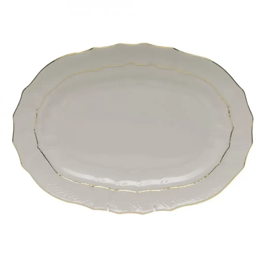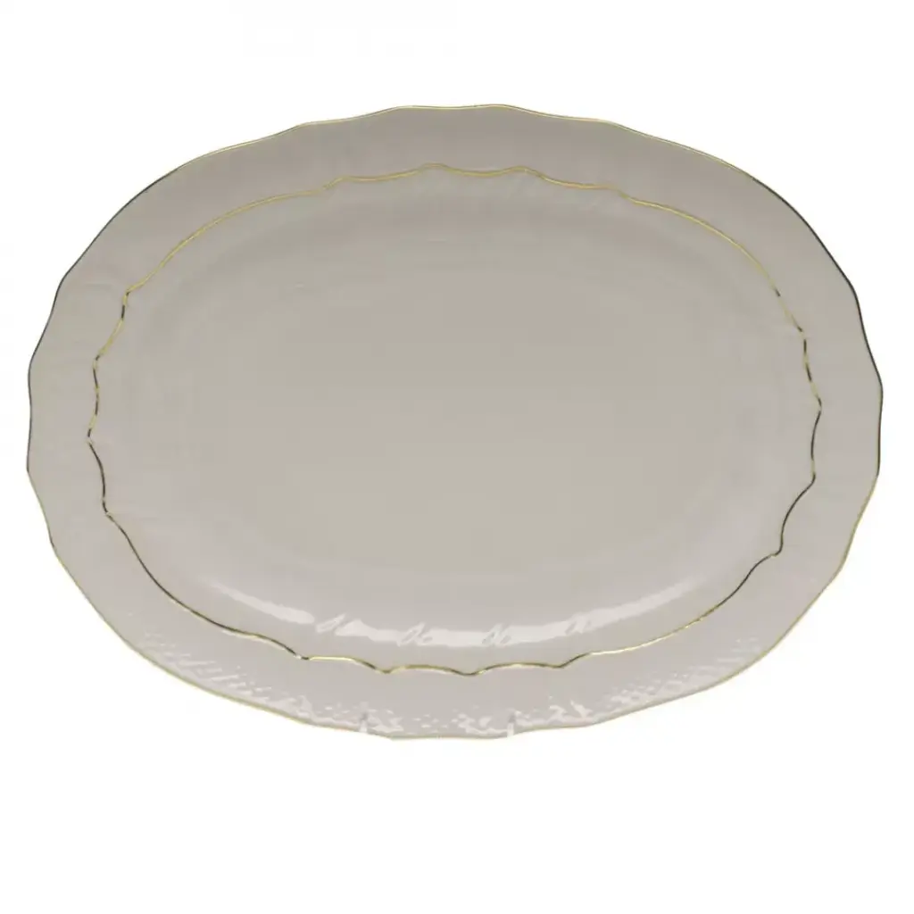 Created for Count Hadik in the early twentieth century, the classic style of Golden Edge celebrates this noble Hungarian family. Janos Hadik served as the president of Herend Porcelain from 1926 to 1933. Hand painted in Hungary. Now the biggest porcelain manufactory in Europe, Herend was founded in 1826 to produce earthenware in the small Hungarian village for which it was named. At the time, Hungary was flooded with low-cost pottery, but in 1839, Mor Fischer became the Manufactory’s new owner and he decided to focus on producing dinnerware replacement pieces for Europe’s royal families to complement their valuable porcelain patterns from Germany and the Far East. As his client base grew, Fischer commissioned his artists to begin designing dinnerware patterns of their own. Queen Victoria’s 1851 purchase of a large set for Windsor Castle was a milestone, setting the stage for aristocrats throughout Europe to clamor for Herend in their estates. In the 1850s, Herend added meticulously-crafted figurines to its creations. Herend’s trademark fishnet pattern, which is widely recognized and prized as Herend’s signature design, started in 1858 when an artist who was intrigued with a Chinese plate’s fish scale design painted it onto a rooster figurine to imitate feathers.