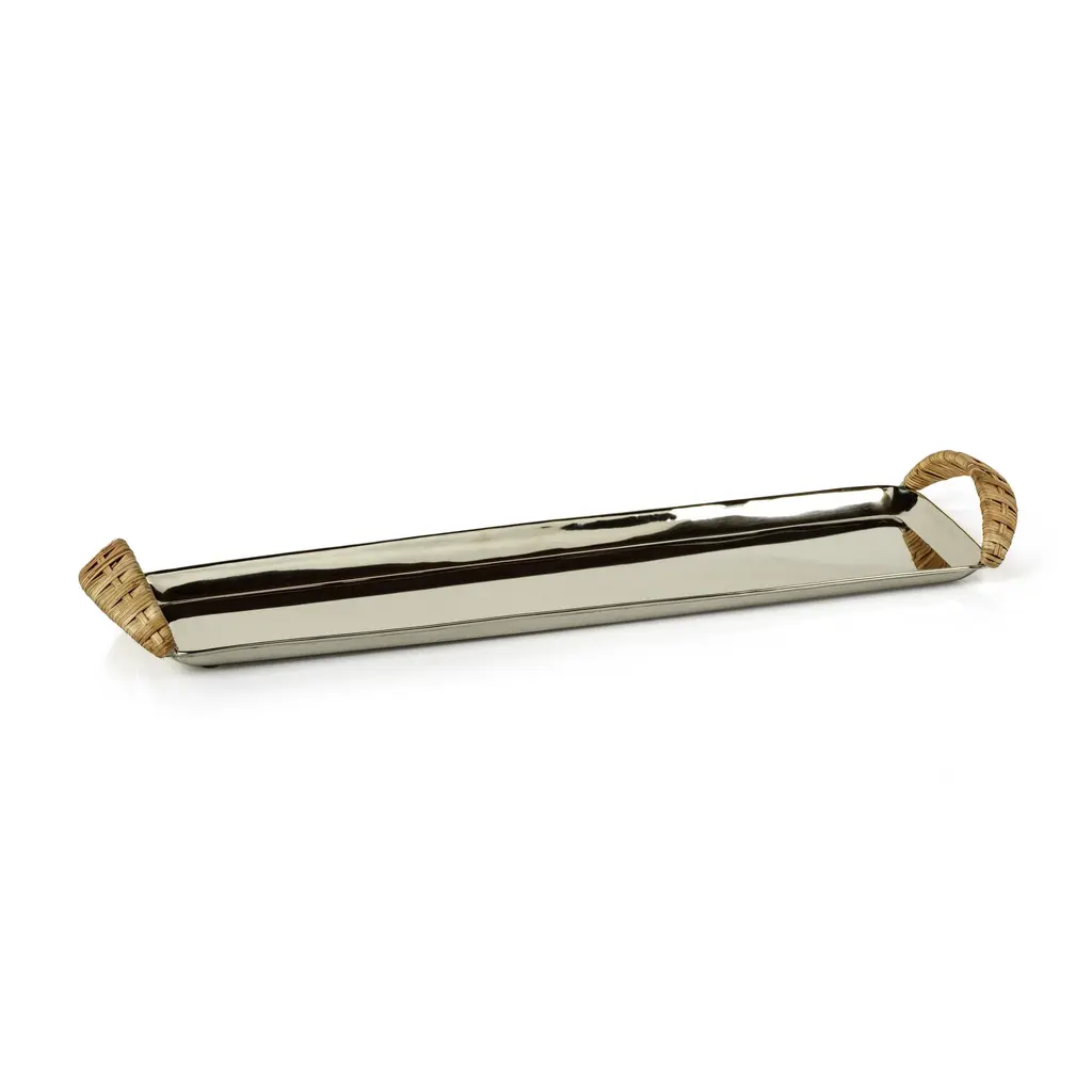 Design, shape, and style are the hallmarks of this Gosford tray. Tray features a mirror-polished stainless steel surface and woven rattan handles. It can be used to hold glasses and bottles on your home bar, or can be conveniently carried to a buffet table to create an area for serving drinks. Nickel plated Rectangular shaped chic stainless steel tray Woven rattan handles allow for easy transport. Round pads at the bottom to protect your furniture and surfaces from scratches. Hand wash. Care Instructions: Hand wash