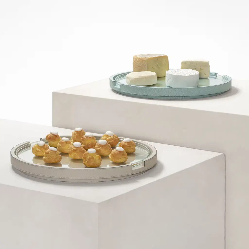 The Gourmet Round Serving Tray is a leather-covered wood structure featuring a removable clear glass inner plate.