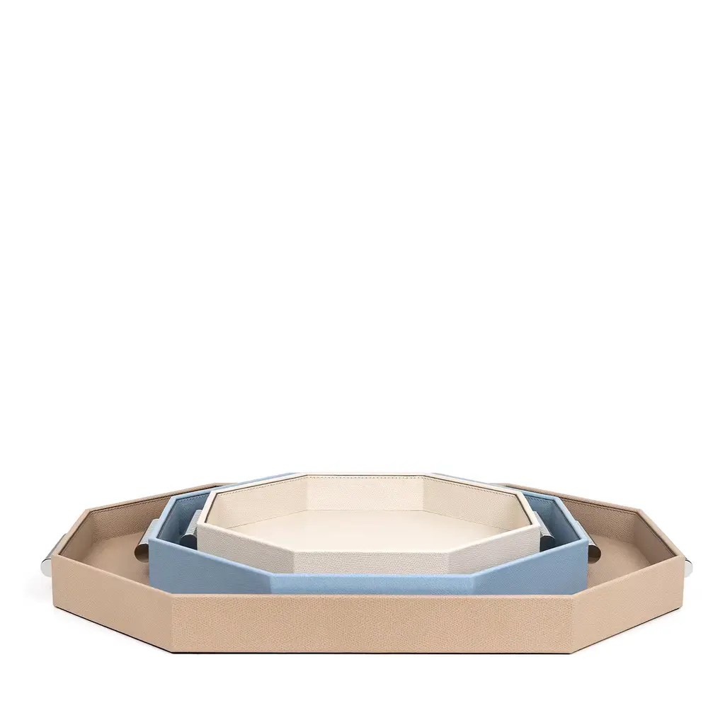 Elegant aesthetic and ergonomic functionality merge in this exquisite tray, boasting a capacious octagonal shape, entirely upholstered with light blue leather enhanced with tone-on-tone stitchings. Completed with chromed handles, it is customizable in leather type, color, size, and metal finish. Please consult the Artemest catalog for other designs from the Grace Collection.