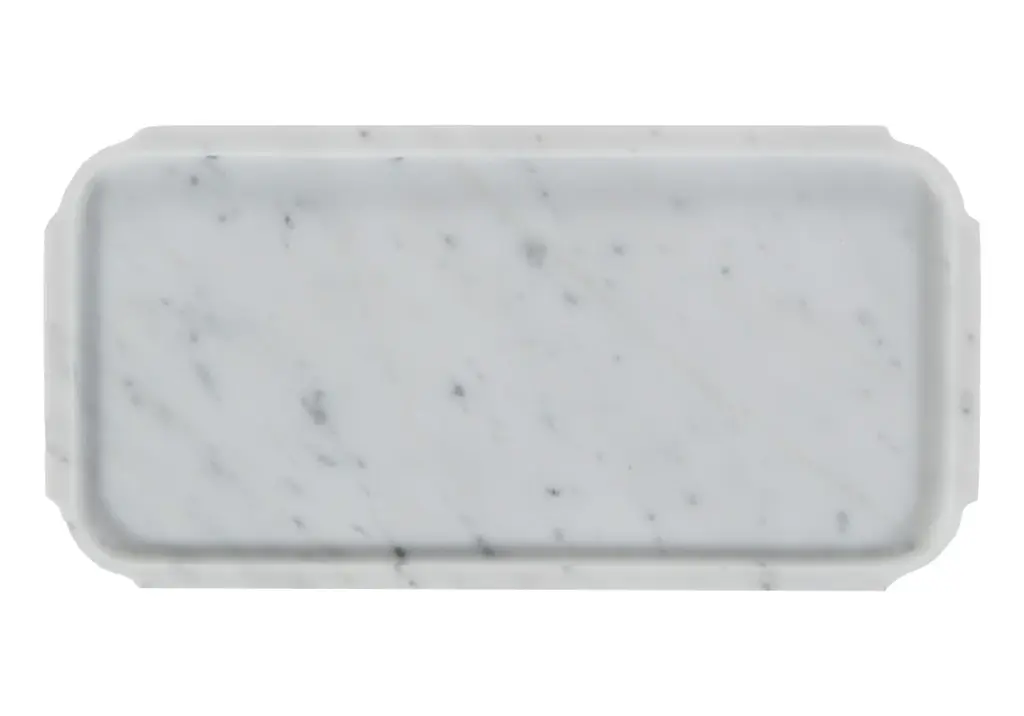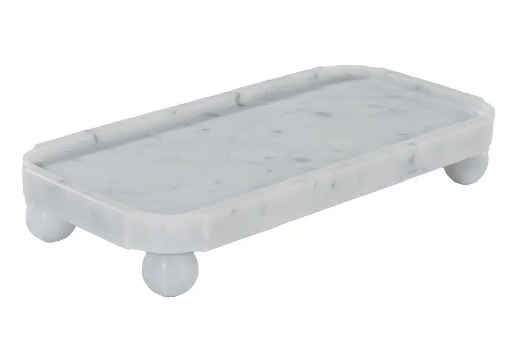 Refined and sophisticated, this Grand Marble Tray is crafted from solid Bianco Carrara for a naturally rich, visually textured design. Chic rounded feet add height complemented by its larger size and versatile style. Pair with lotions, soaps, or decor items for a an effortlessly, elegant addition.