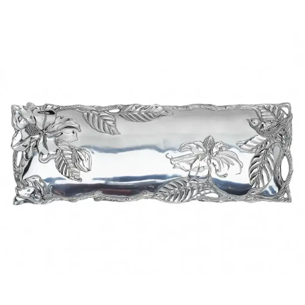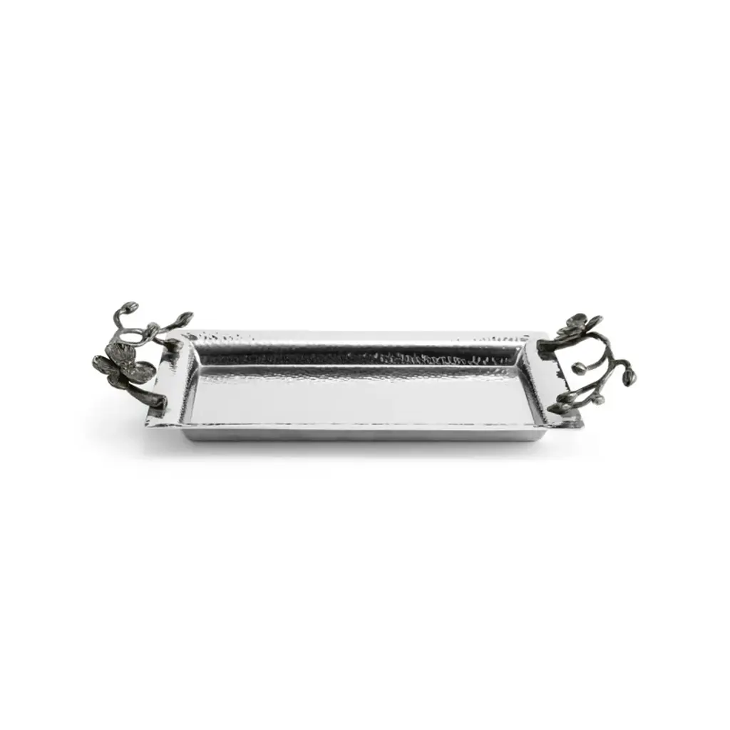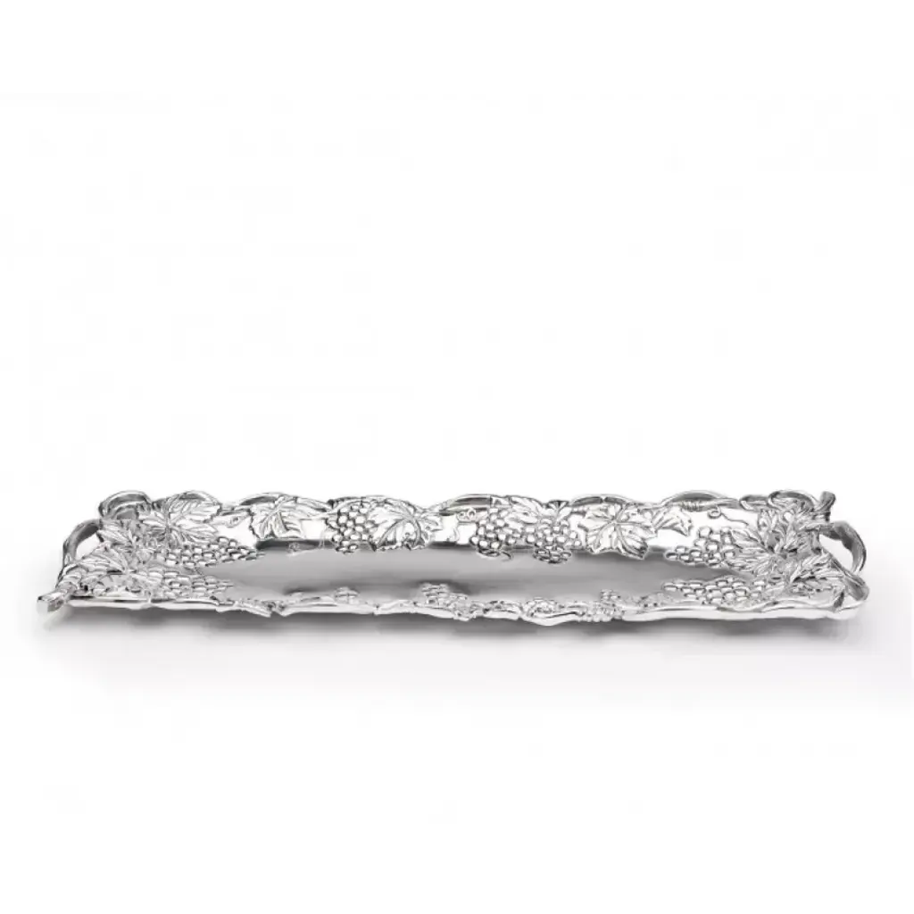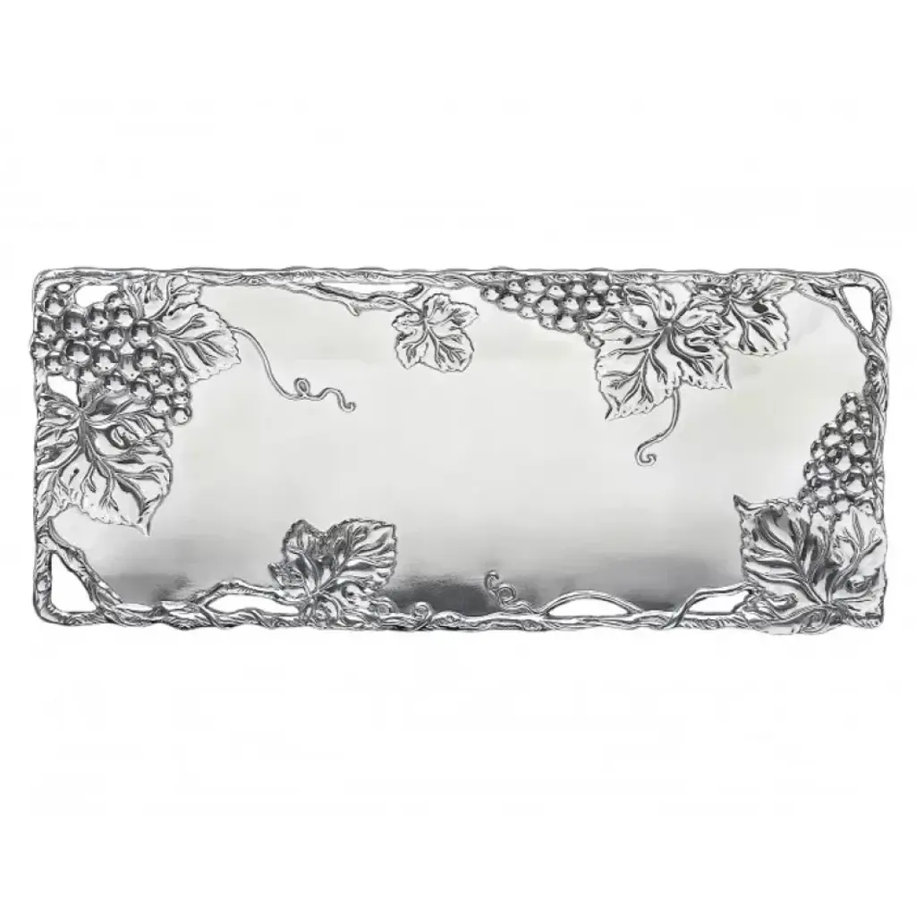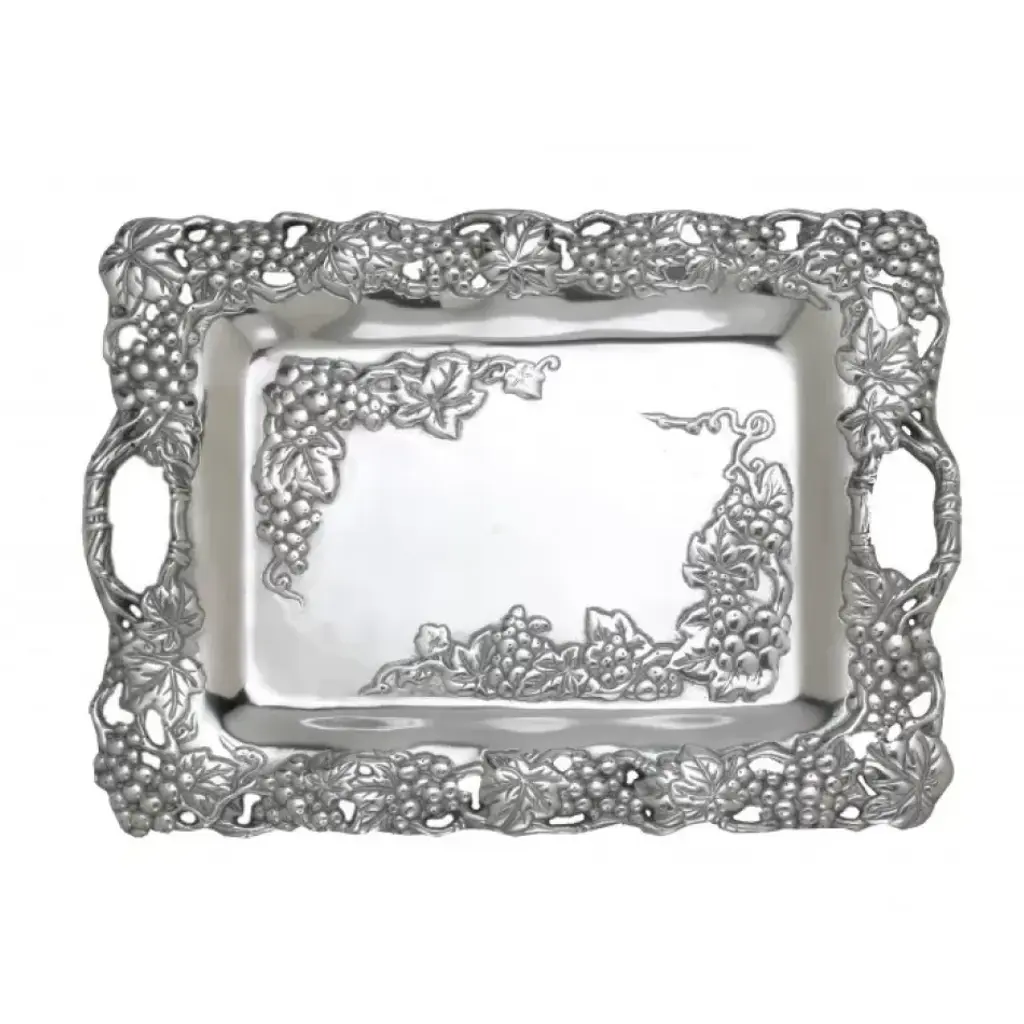Continue your Grape Collection with this fashionable Vineyard Oblong Tray from Arthur Court. Thick vines create the piece's openwork border, while a few extend the pattern into the interior. Veiny leaves and bundles of grapes accent the otherwise smooth interior of this handmade, aluminumt tray with their detailed designs.